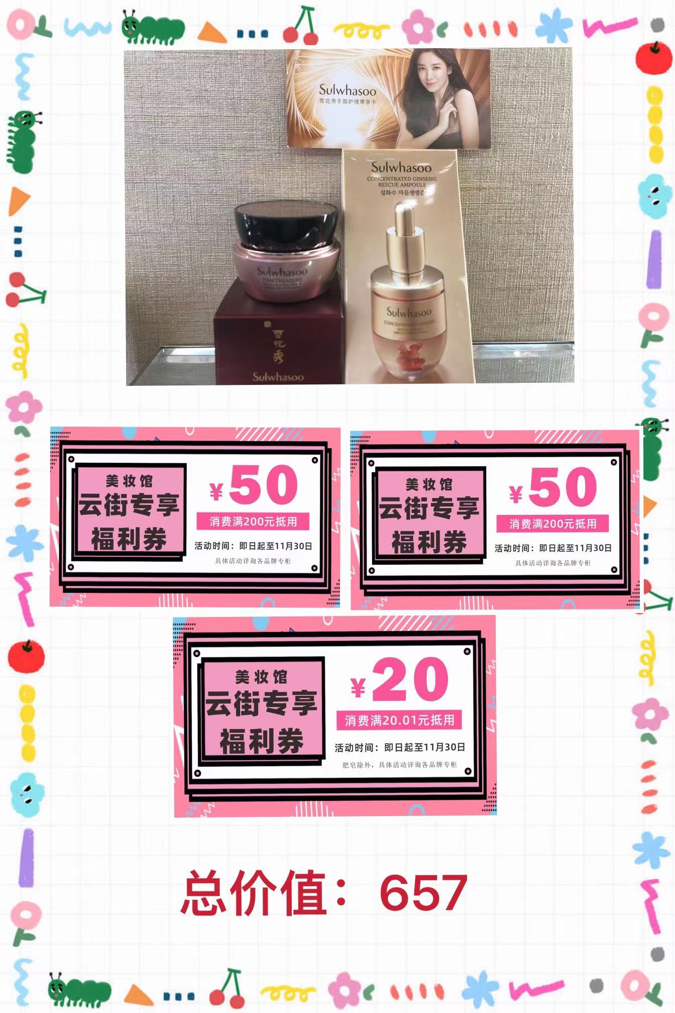 雪花秀(安瓶3.5G价值146,臻金面霜4毫升价值212,玉石手护价值179,两张50元现金券一张20元现金券)