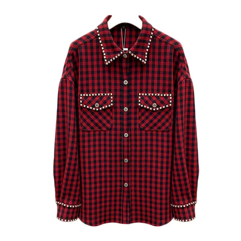 JORYA卓雅2021冬季新款翻领钉钻长袖格子衬衫外套
