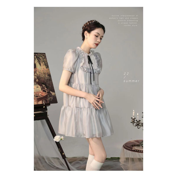AIVEI2022夏季新款蝴蝶结立领公主泡泡袖宽松拼接压褶连衣裙
