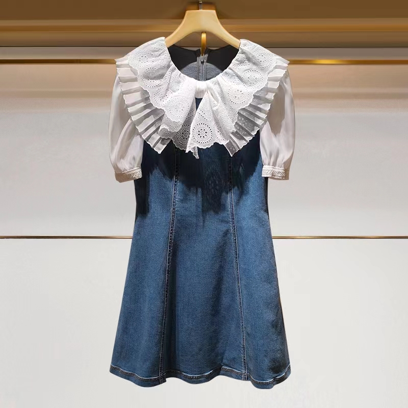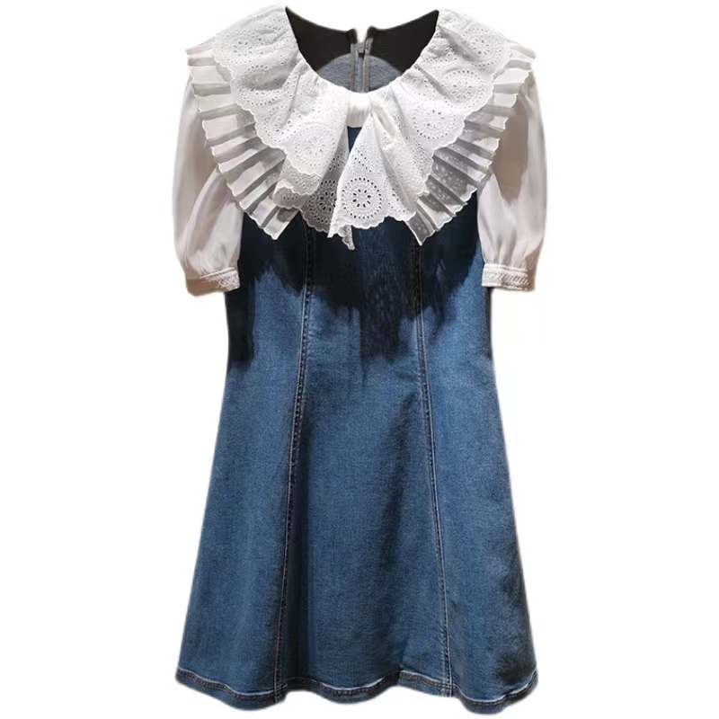 JORYA2022夏季新款压褶花边娃娃领网纱拼接水洗牛仔高腰A字连衣裙 返回首页 返回商品页