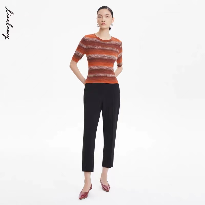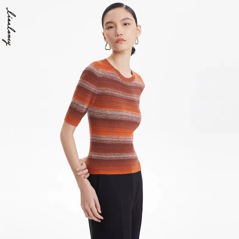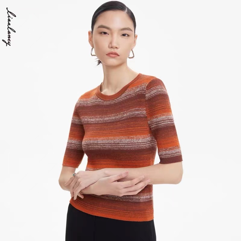LANCY/俪雅朗姿2022秋季新款圆领羊毛针织衫条纹撞色收腰女士毛衣