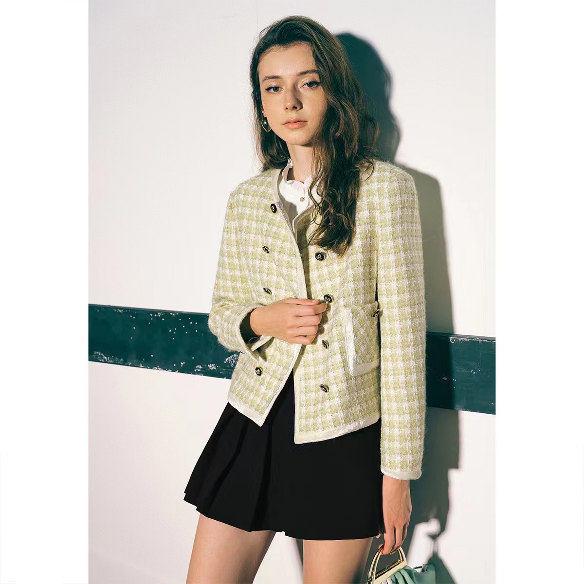 诗篇女装新款宽松圆领千鸟格学院小香风羊毛短外套