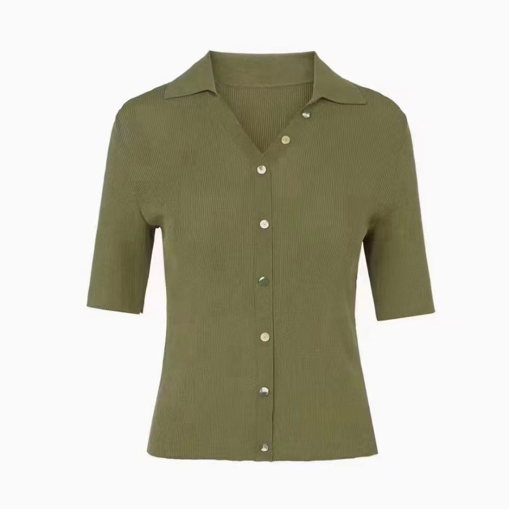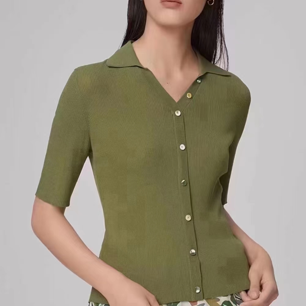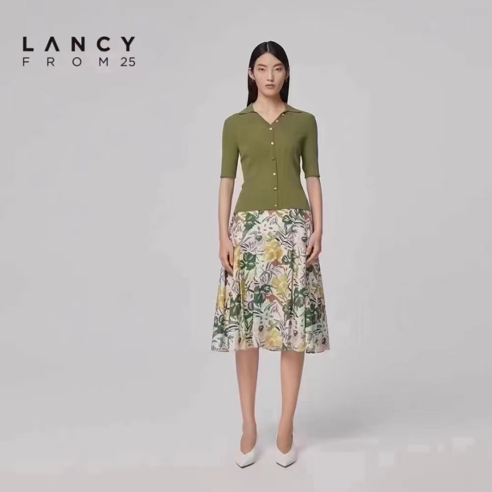 朗姿2023春款小V翻领收腰显瘦针织衫女