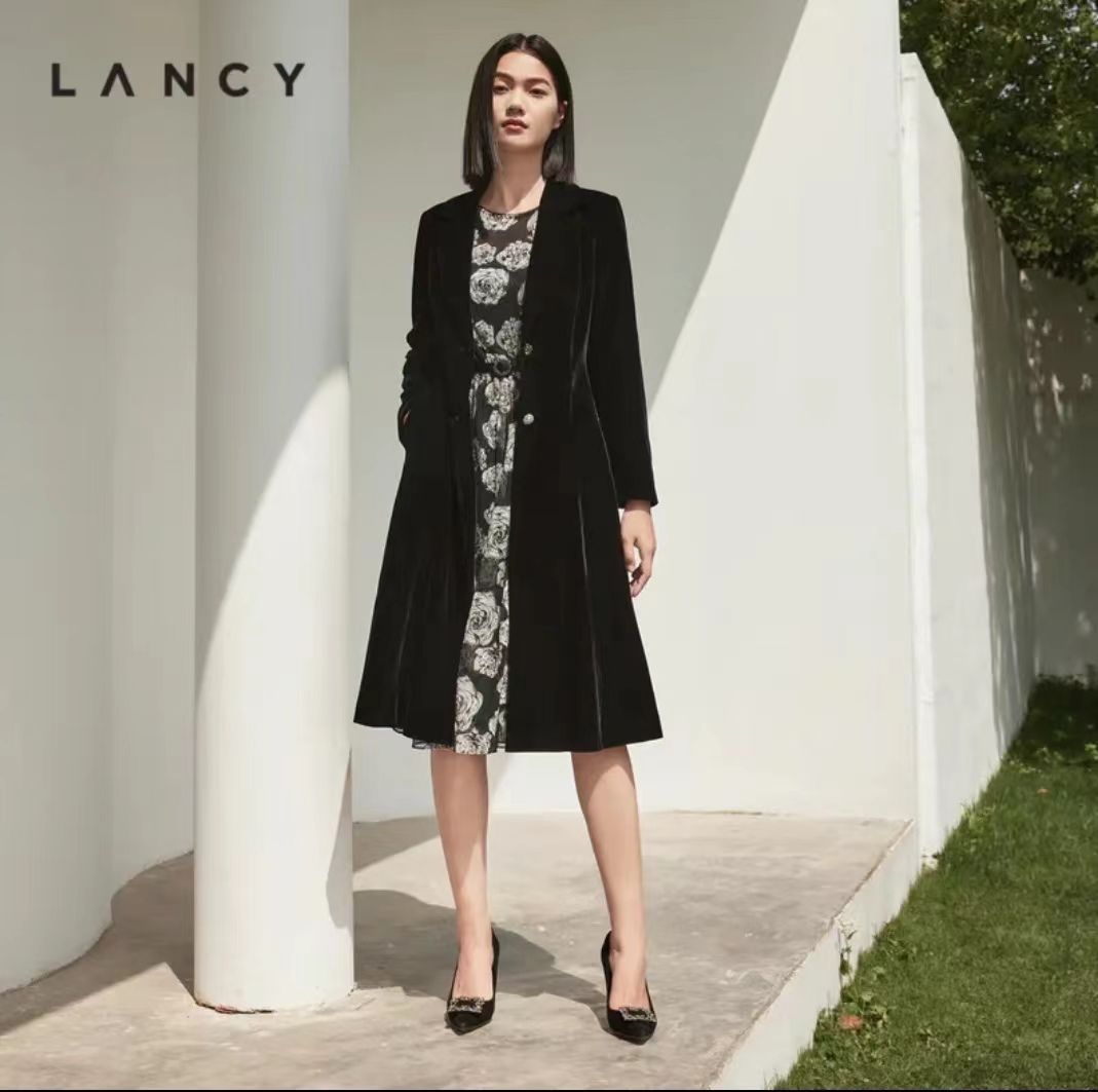 朗姿服饰中长款丝绒黑色复古丝滑大衣