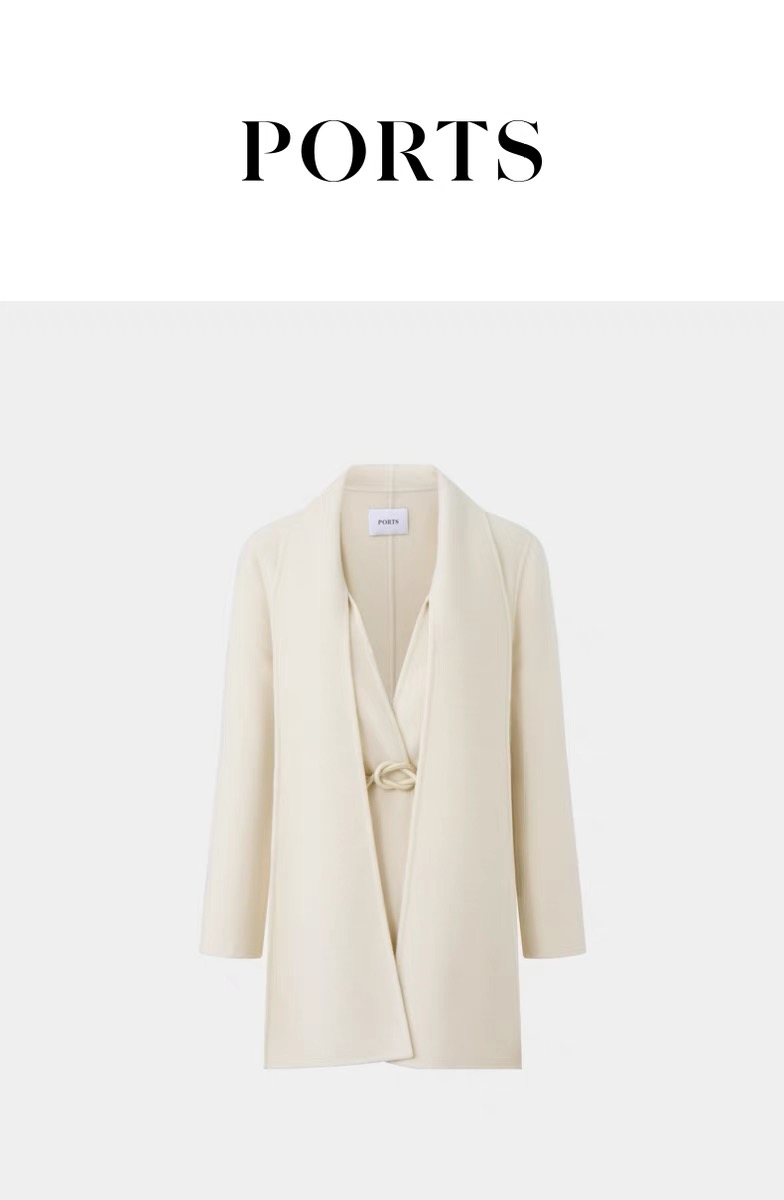 时尚设计感奶白色围巾领造型毛呢大衣