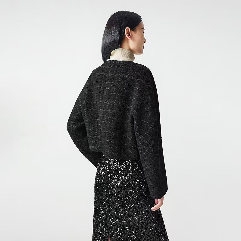 朗姿高级黑色羊毛圆领百搭通勤上衣
