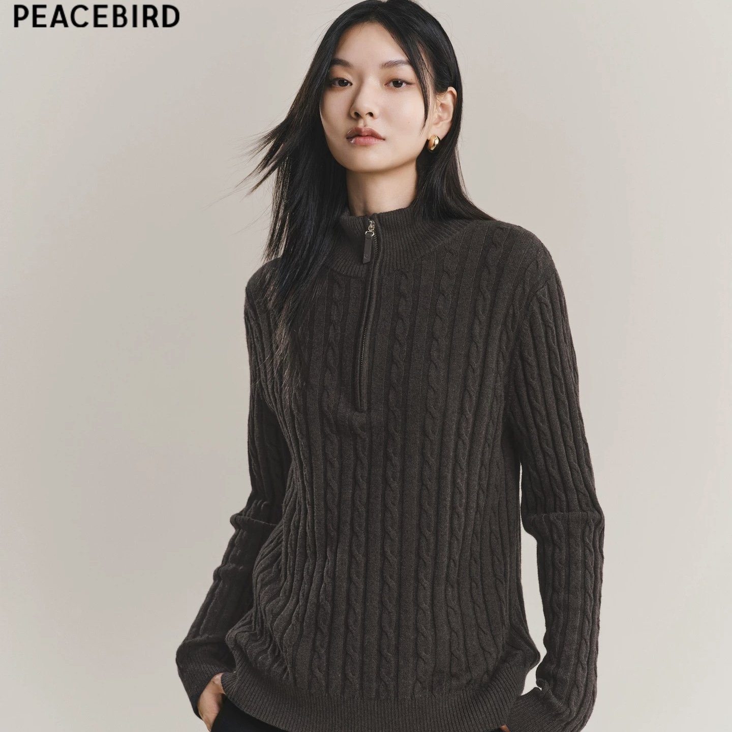 太平鸟羊绒混纺半开襟绞花半高领针织衫