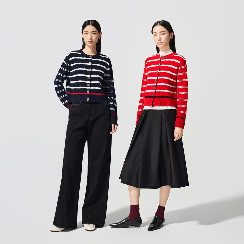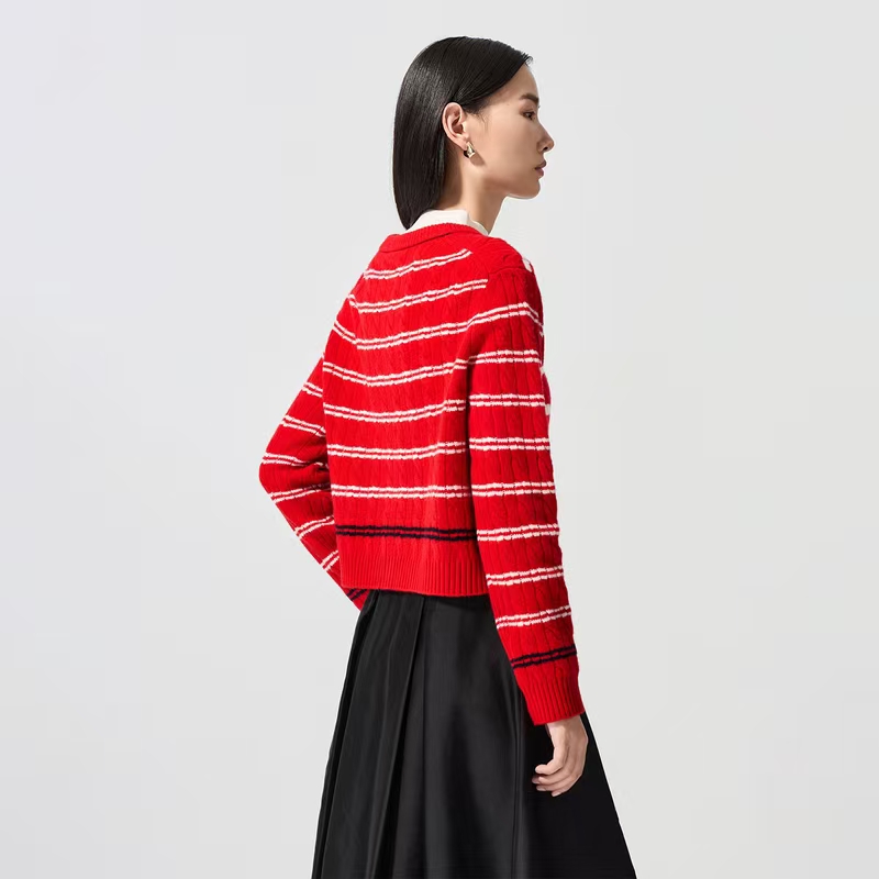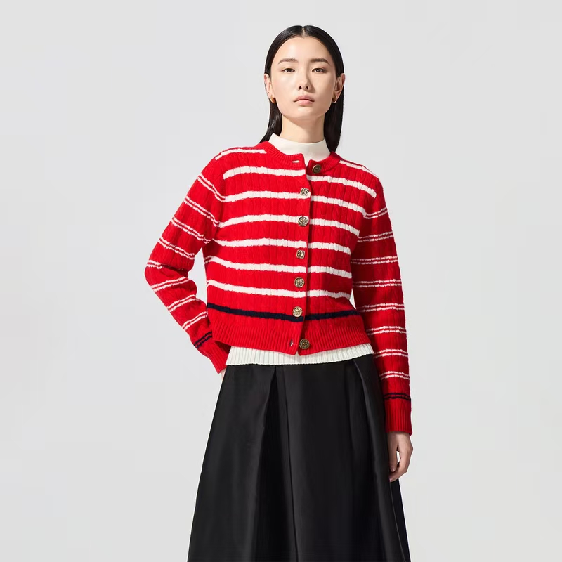 朗姿服饰2026春节复古羊毛条纹短针织开衫
