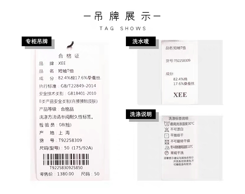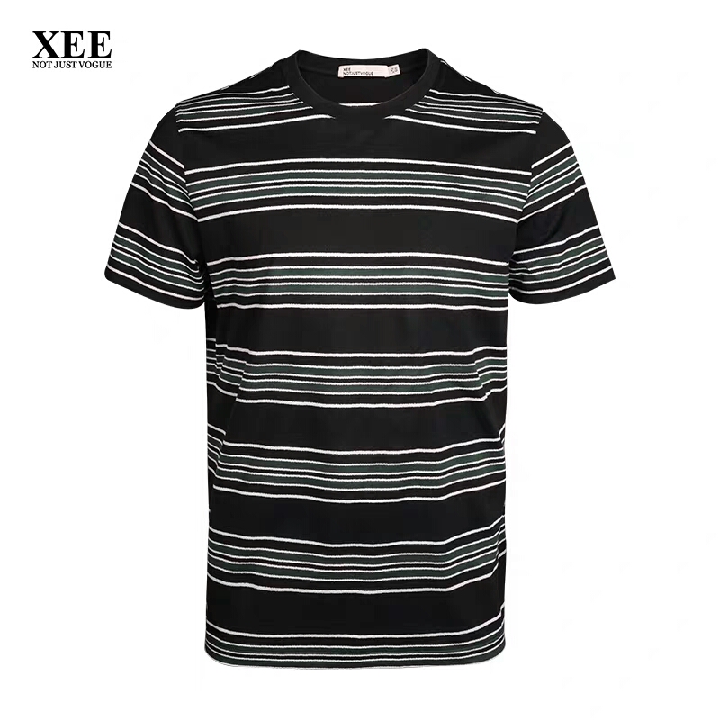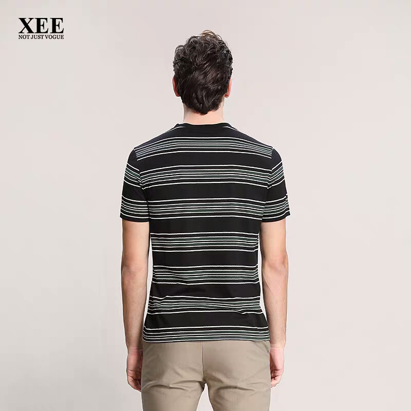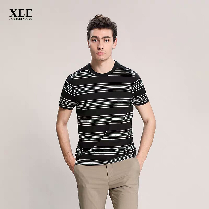 XEE商场同款圆领横条纹黑色短袖时尚都市百搭桑蚕丝男T恤