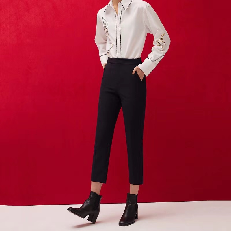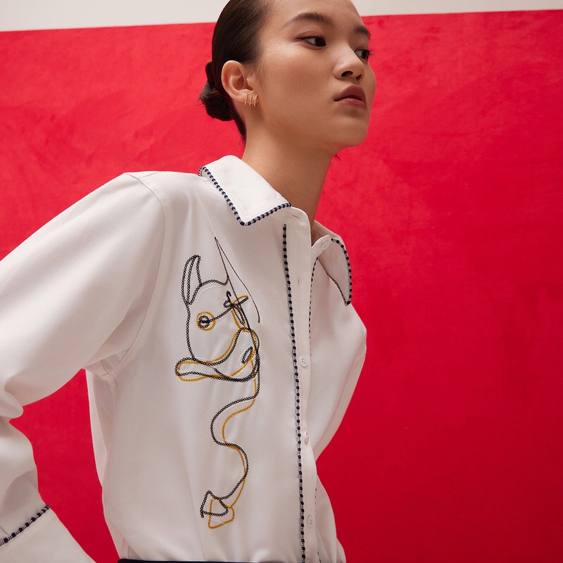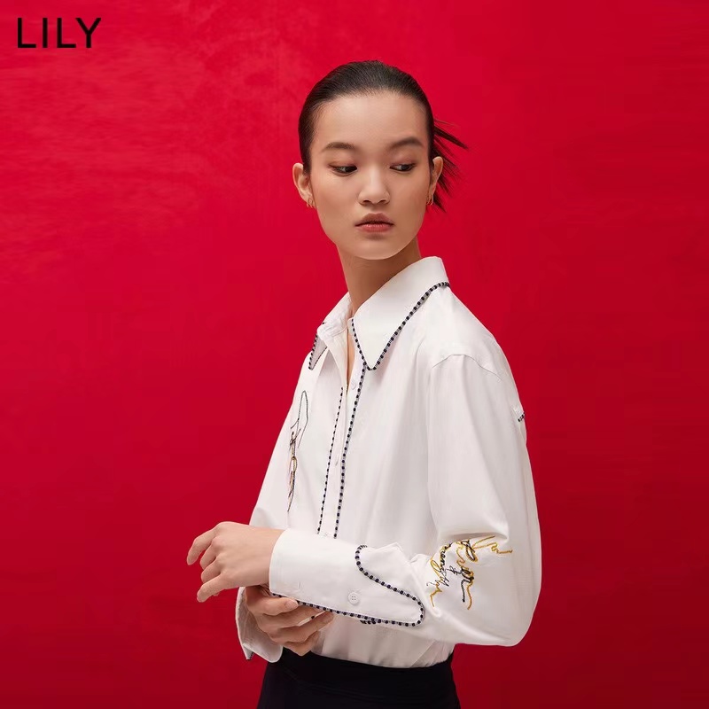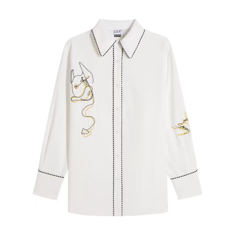 LILY2021春装新款艺术感刺绣牛牛直筒长袖白衬衫