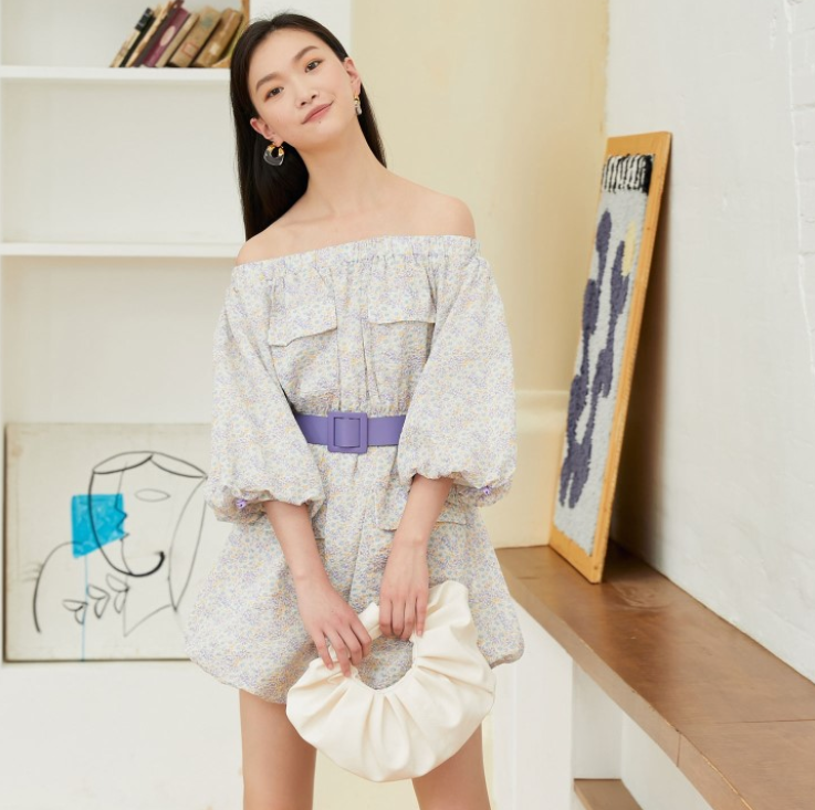 Vero Moda2021春夏新款碎花一字领泡泡袖蓬蓬衬衫连衣裙女