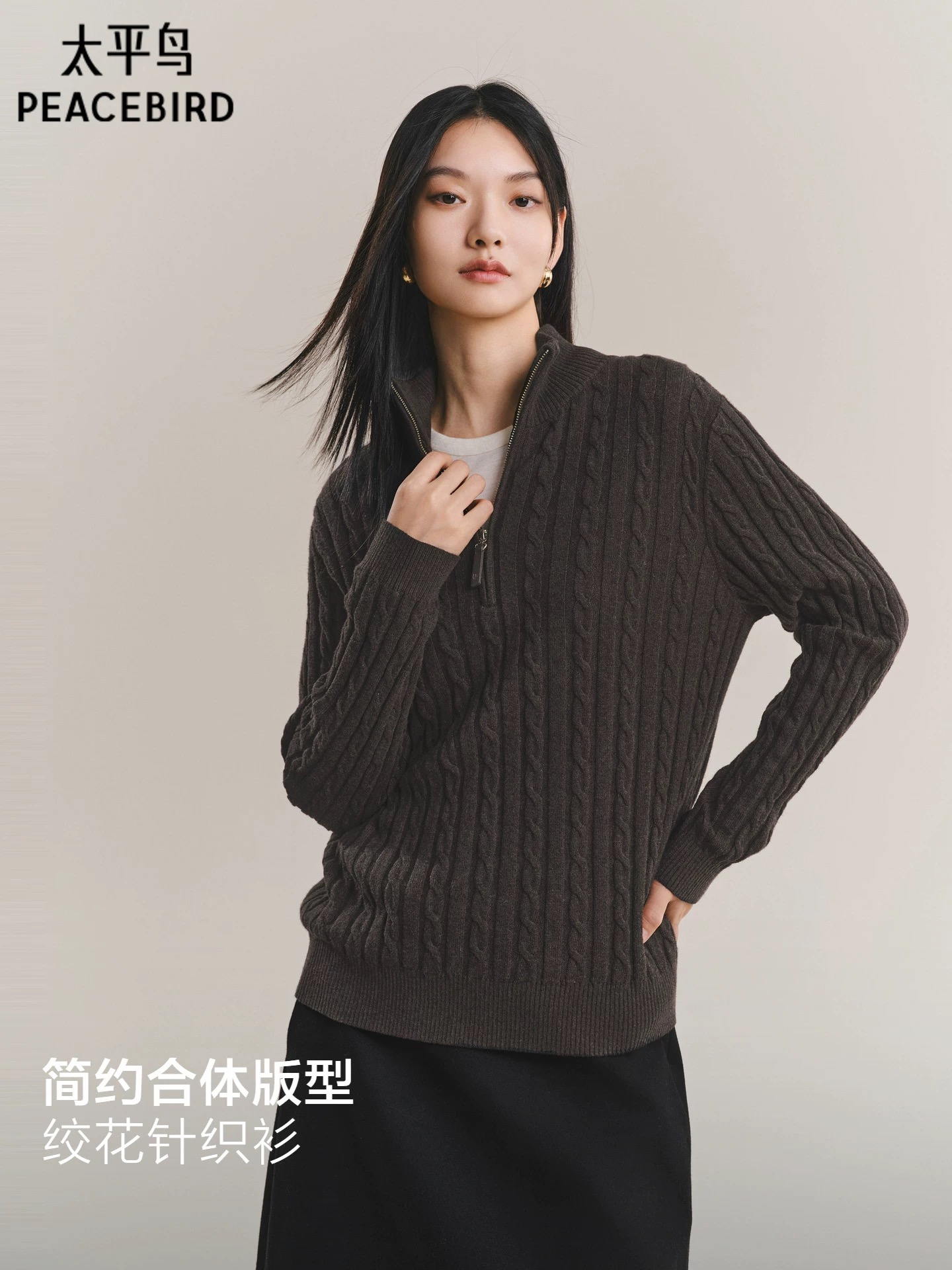 太平鸟羊绒混纺半开襟绞花半高领针织衫