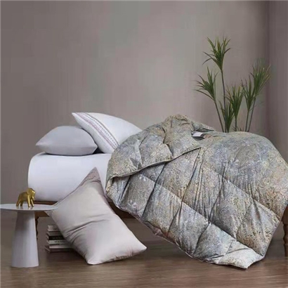抗菌白鹅绒填充,绒子含量95%,T4级填充量,适合0-8℃卧室环境。 羽绒被特制的专业防绒面料,既保持全棉的顺滑亲肤,又强化了防绒耐磨能力;优雅的灰蓝色调与对称的藤蔓花叶纹样,整体视觉干净又清新。
