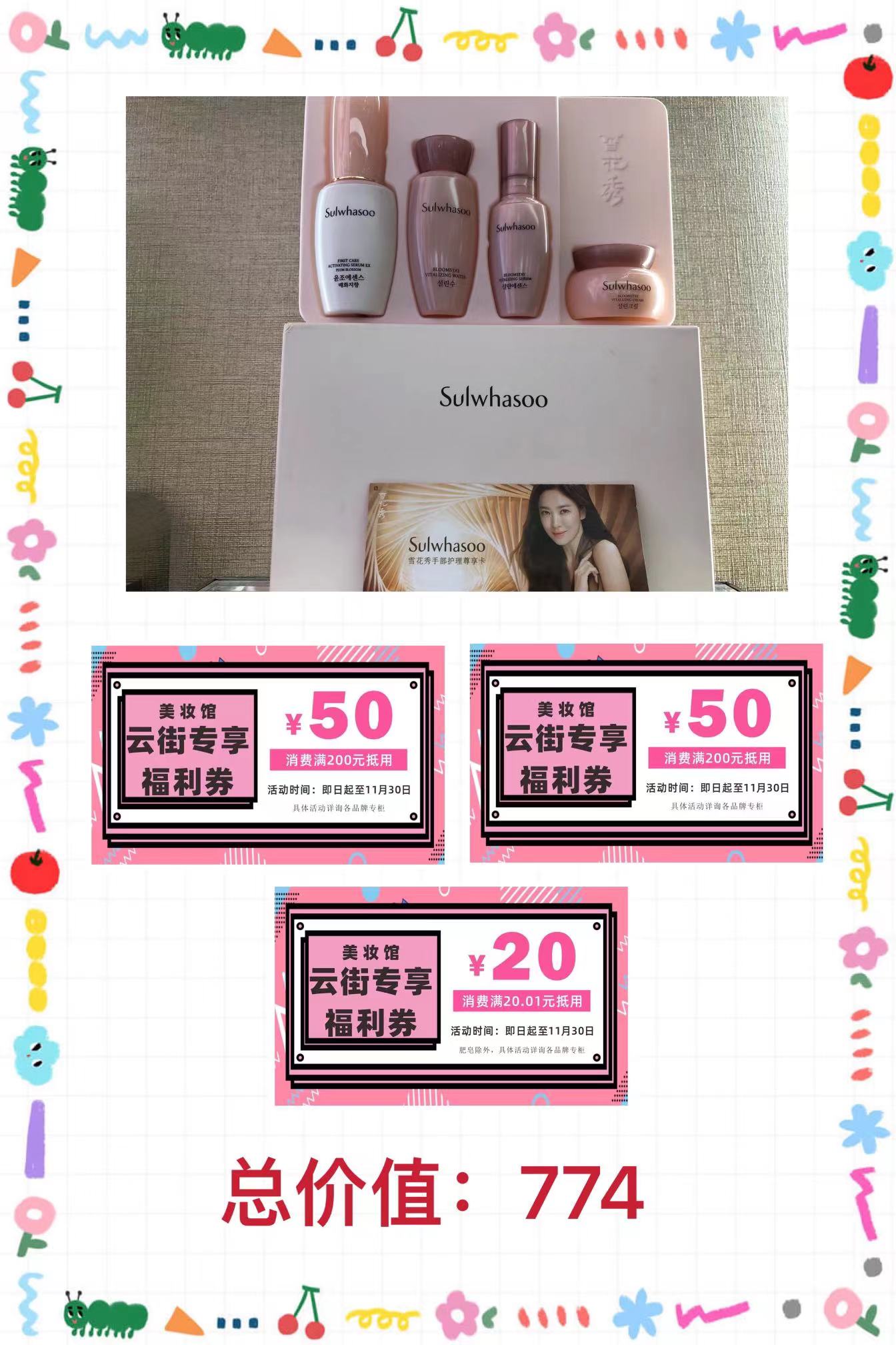 雪花秀(润燥价值143,水价值56,精华价值168,霜价值108,玉石手护价值179,两张50元现金券一张20元现金券)