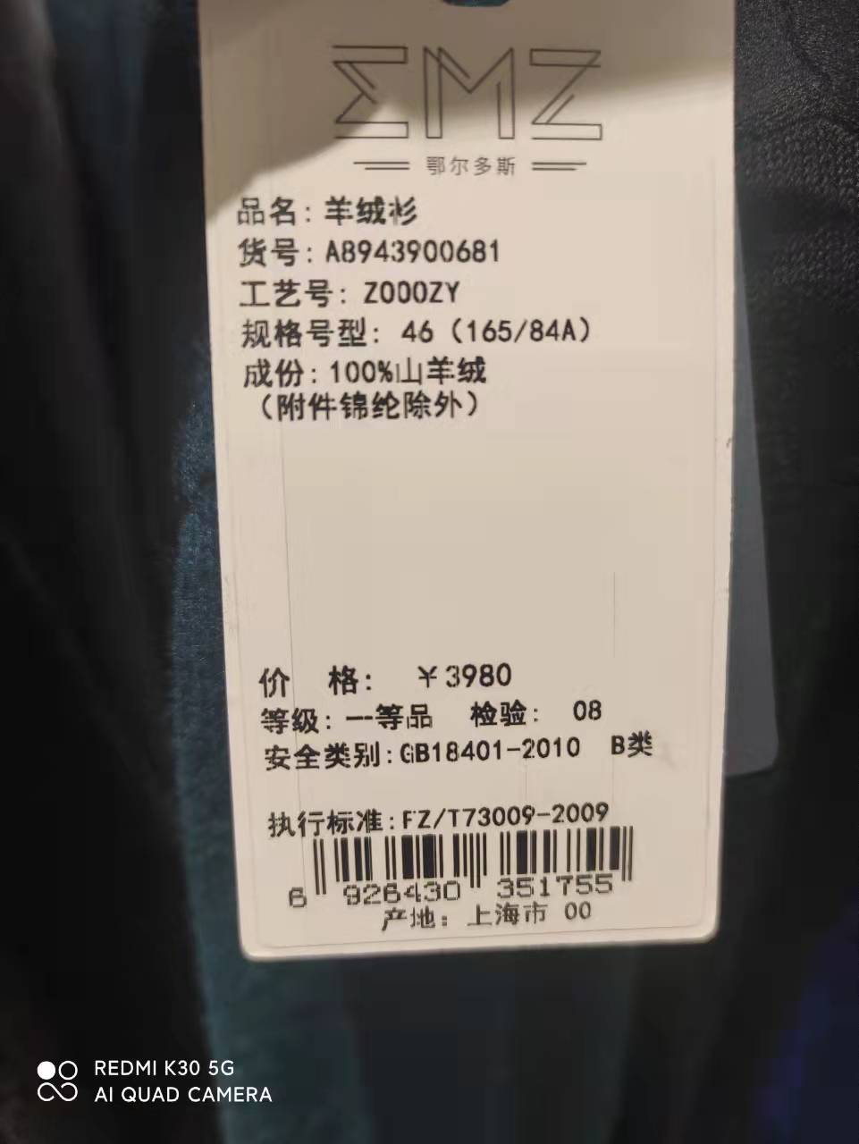 EMZ 鄂尔多斯羊绒衫手感细腻丰满,像婴儿般肌肤一样柔软,特别温暖