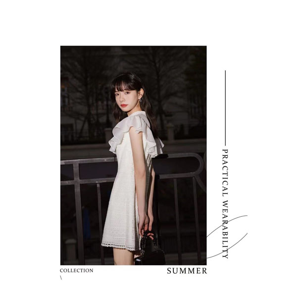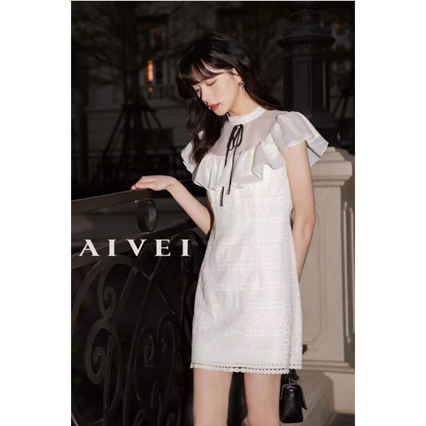 淑女装>>AIVEI 2022夏款新品蝴蝶结立领网纱荷叶边无袖复古优雅连衣裙