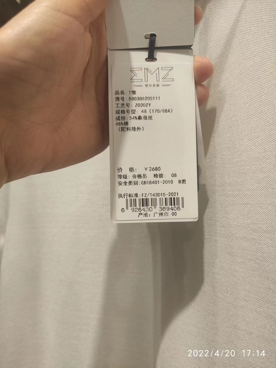 本款T恤采用54%的苏州辑里丝,46%的埃及长绒棉织就而成,轻,薄,柔透,吸湿透气性好,具有防紫外线功能,