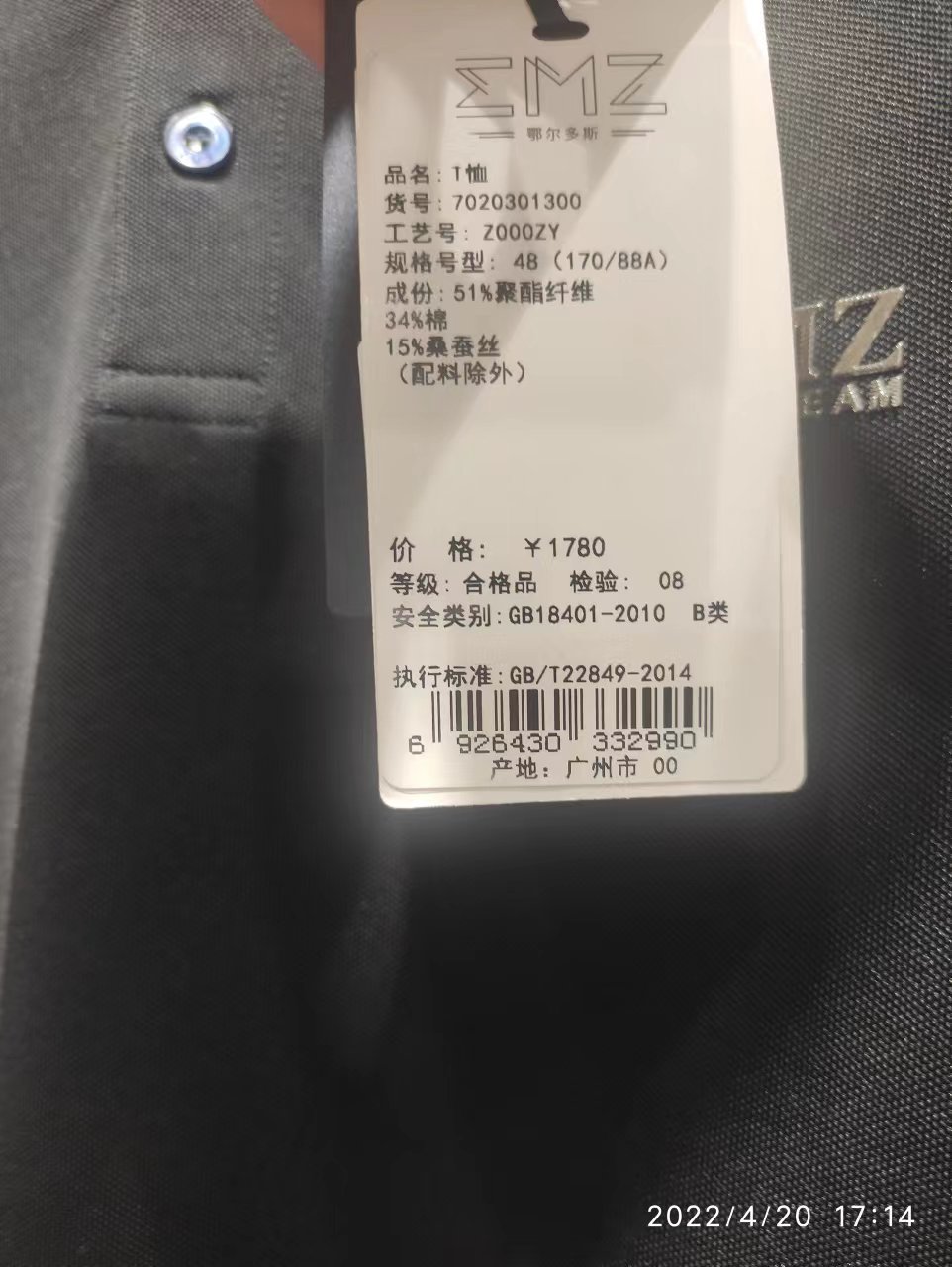 这款T恤采用的是棒球领的设计,新颖时尚,有51%的聚酯纤维,34%棉,15%桑蚕丝织就而成,吸湿透气性能好,具有防蚊虫功能,易打理