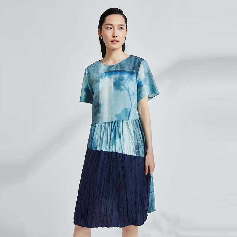 >>OTT服饰2021夏拼接压皱印花连衣裙