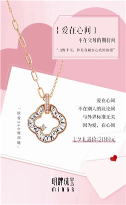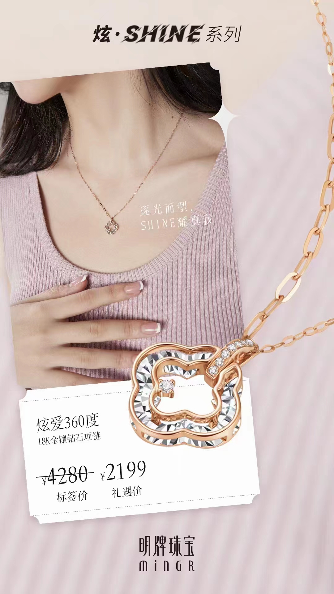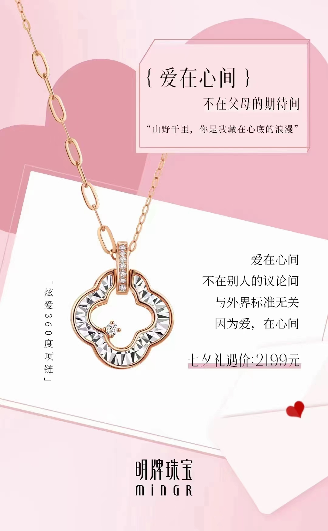 七夕,绝佳的告白时机 别把爱藏在心底,大胆炫出来 高光耀现爱的火花,镜面车花炫映甜蜜美钻 光韵恋语释放璀璨爱意 #明牌珠宝 炫爱360度项链 七夕礼遇¥2199,爱耀加倍💞