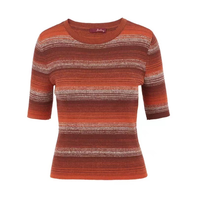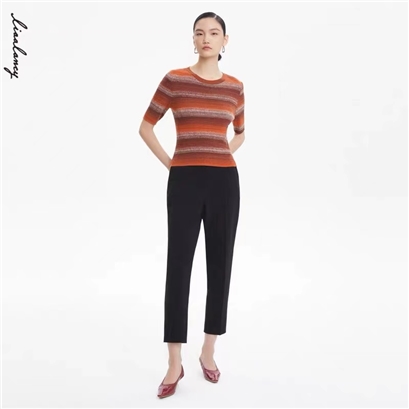 淑女装>>LANCY/俪雅朗姿2022秋季新款圆领羊毛针织衫条纹撞色收腰女士毛衣