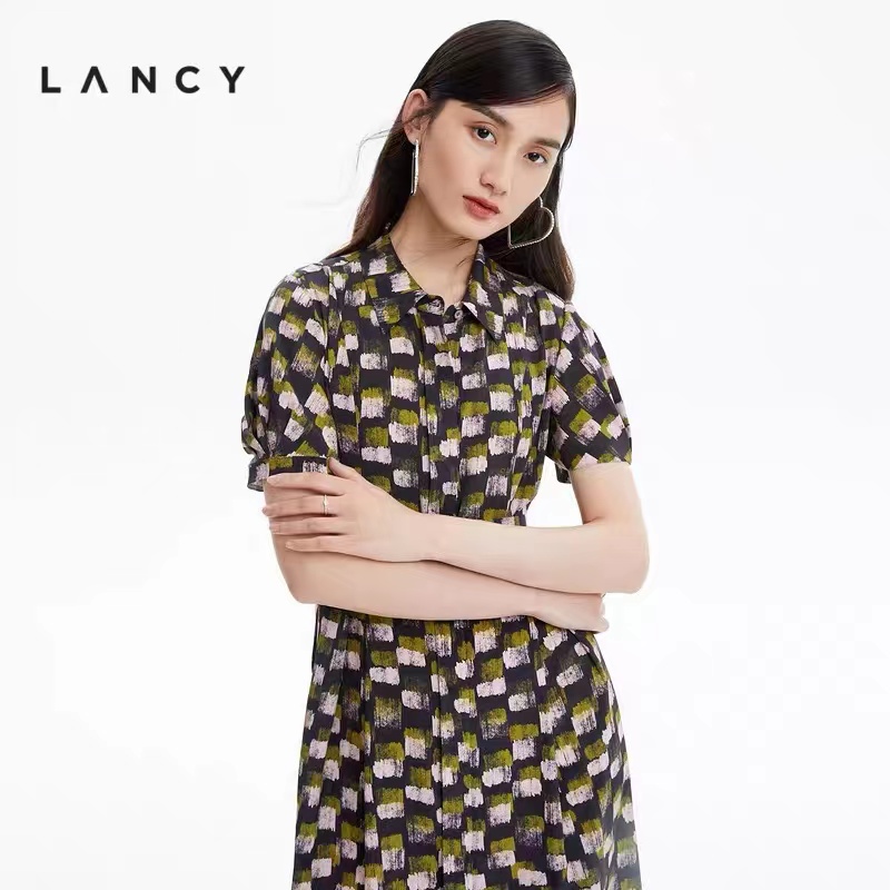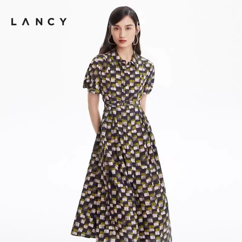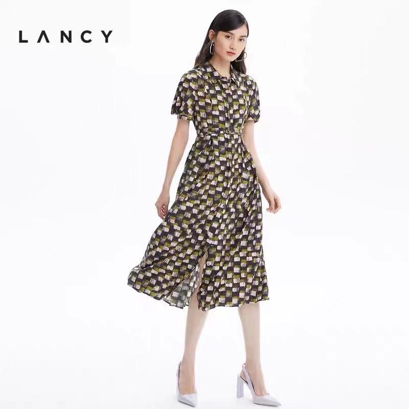 LANCY/朗姿女2022夏新款衬衫式真丝连衣裙系带收腰裙子