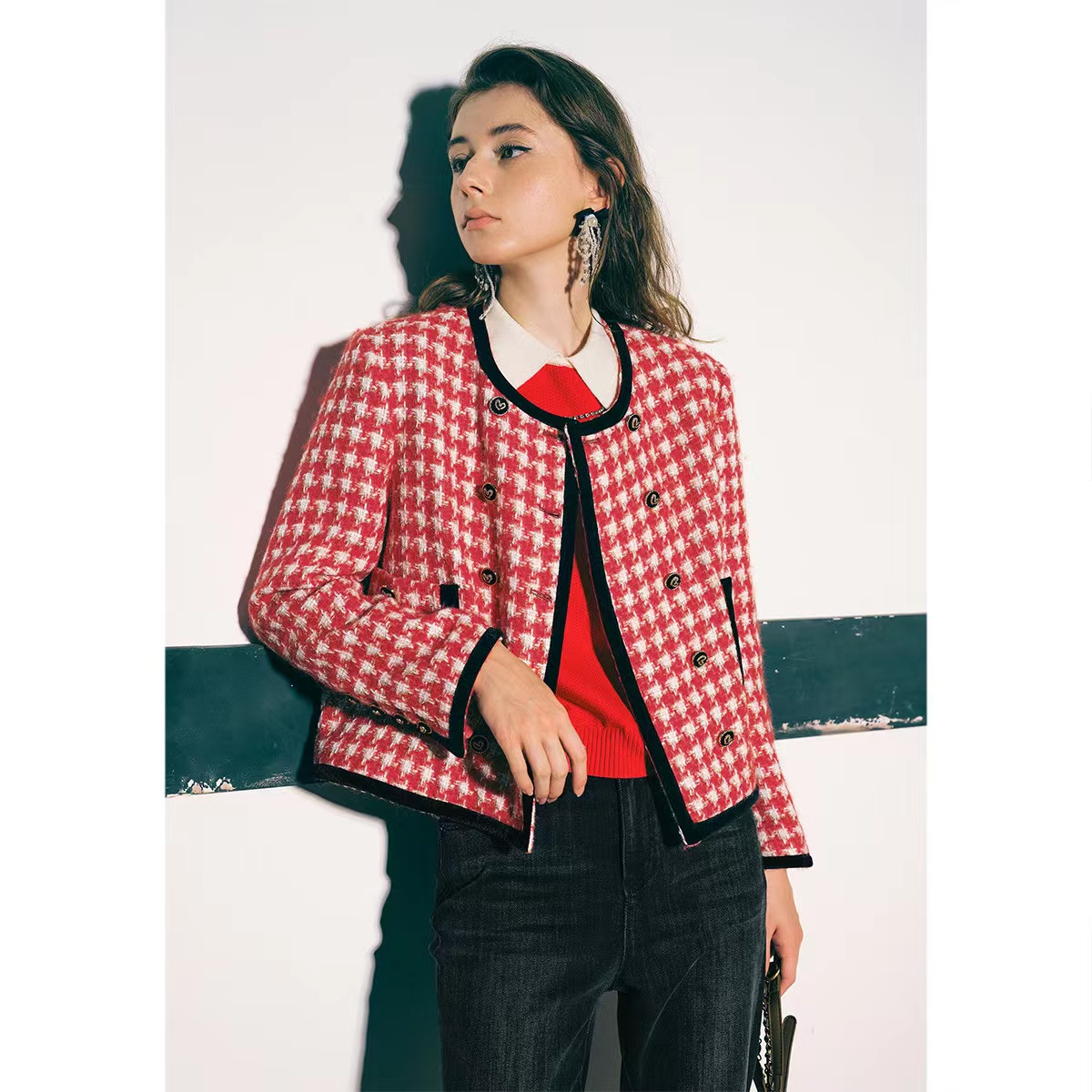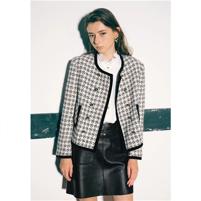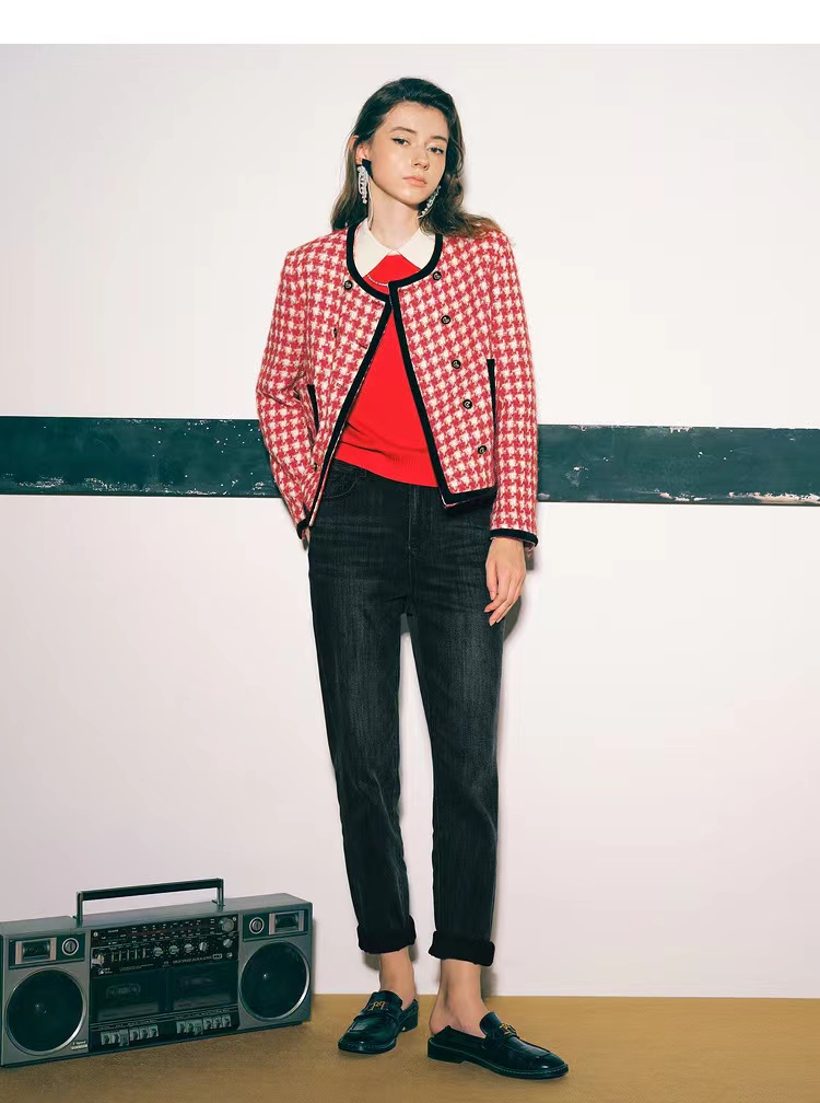 >>诗篇女装新款宽松圆领千鸟格学院小香风羊毛短外套