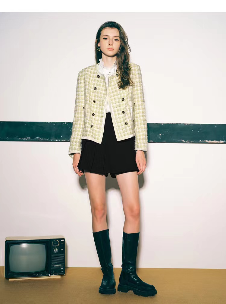 诗篇女装新款宽松圆领千鸟格学院小香风羊毛短外套