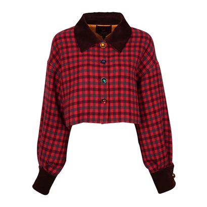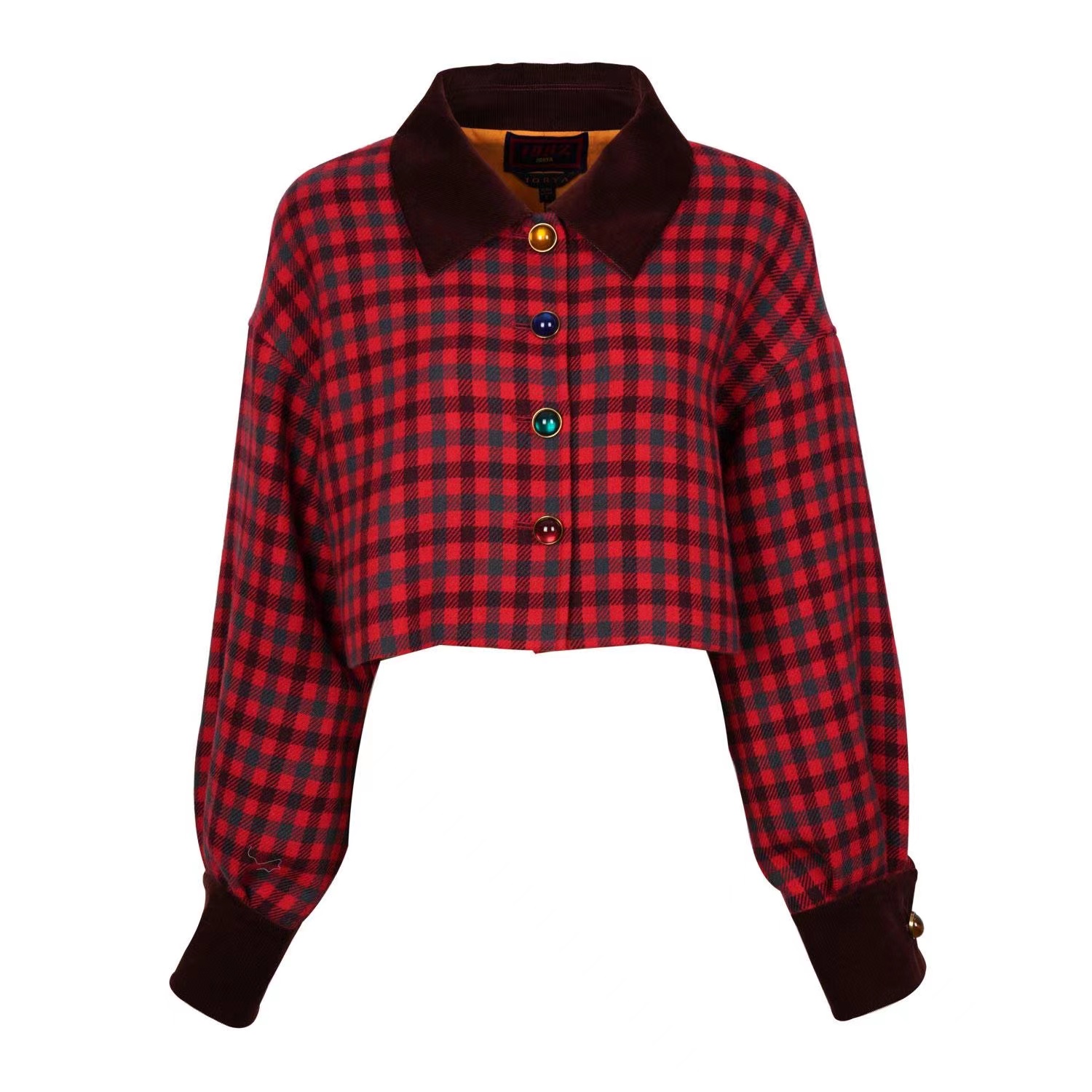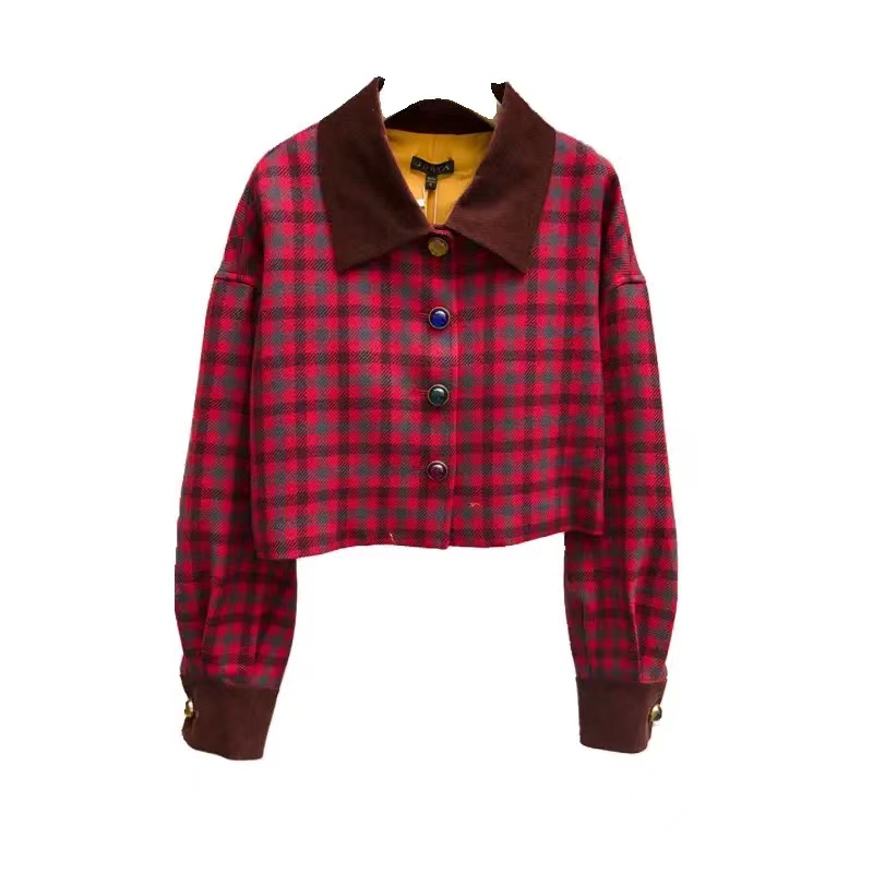 卓雅2022冬新款翻领字母刺绣红色格子短外套O164502E