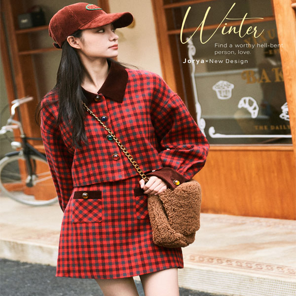 卓雅2022冬新款翻领字母刺绣红色格子短外套