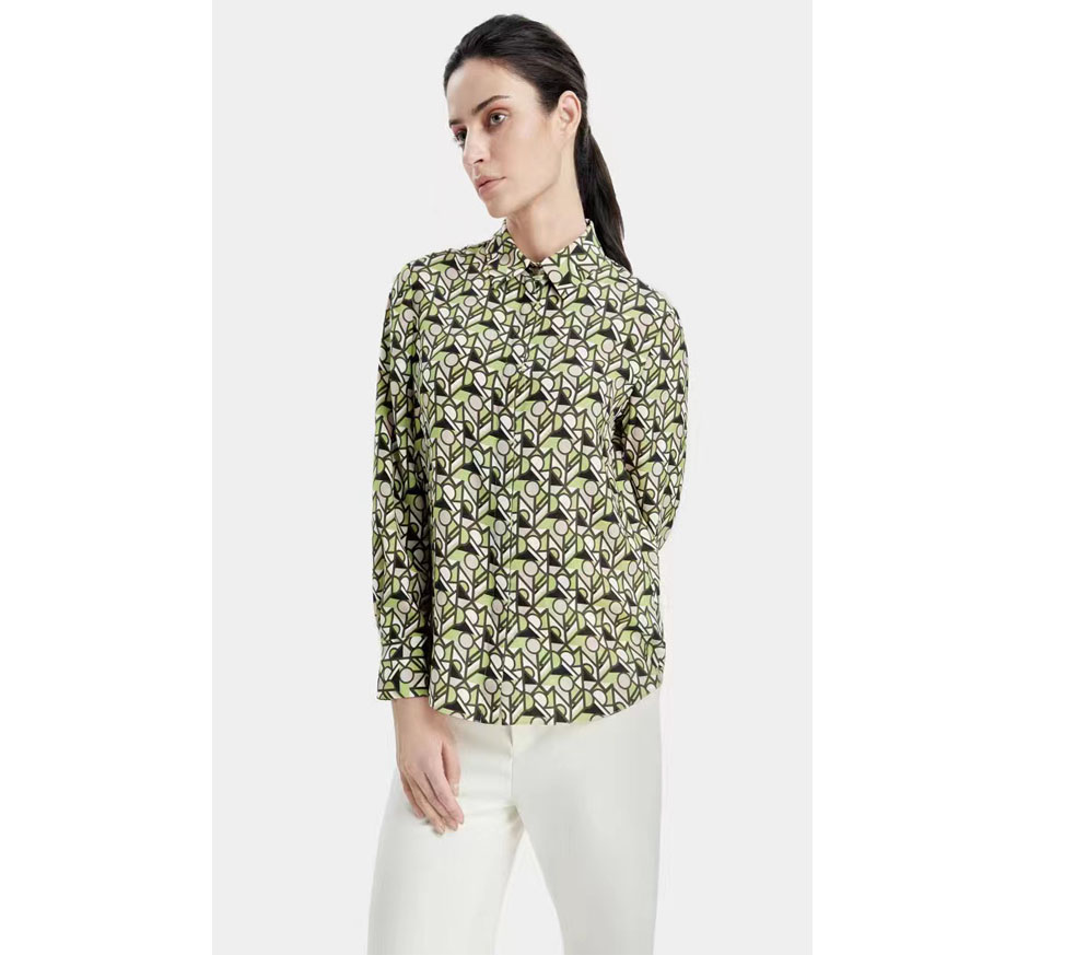 甄选羊毛羊绒混纺双面呢,新颖的暖银灰色调与斜纹提花结合,搭配深受时尚圈追捧的直身版型,兼具了保暖又复古摩登的气息;相拥双P胸针的装饰精致奢华,勾勒都市飒气英姿。 “迷境几何”印花衬衫 “迷境几何”将PORTS的字母通过几何图案与本季流行色彩结合,打造出仿佛迷宫一般图案,极具视觉冲击力;真丝弹力重绉的光泽感完美地提升印花造型质感,也确保上身舒适度。无论单穿或是作为内搭呈现都可点亮冬季造型,让人眼前一亮。 橄榄绿金属装饰针织上衣