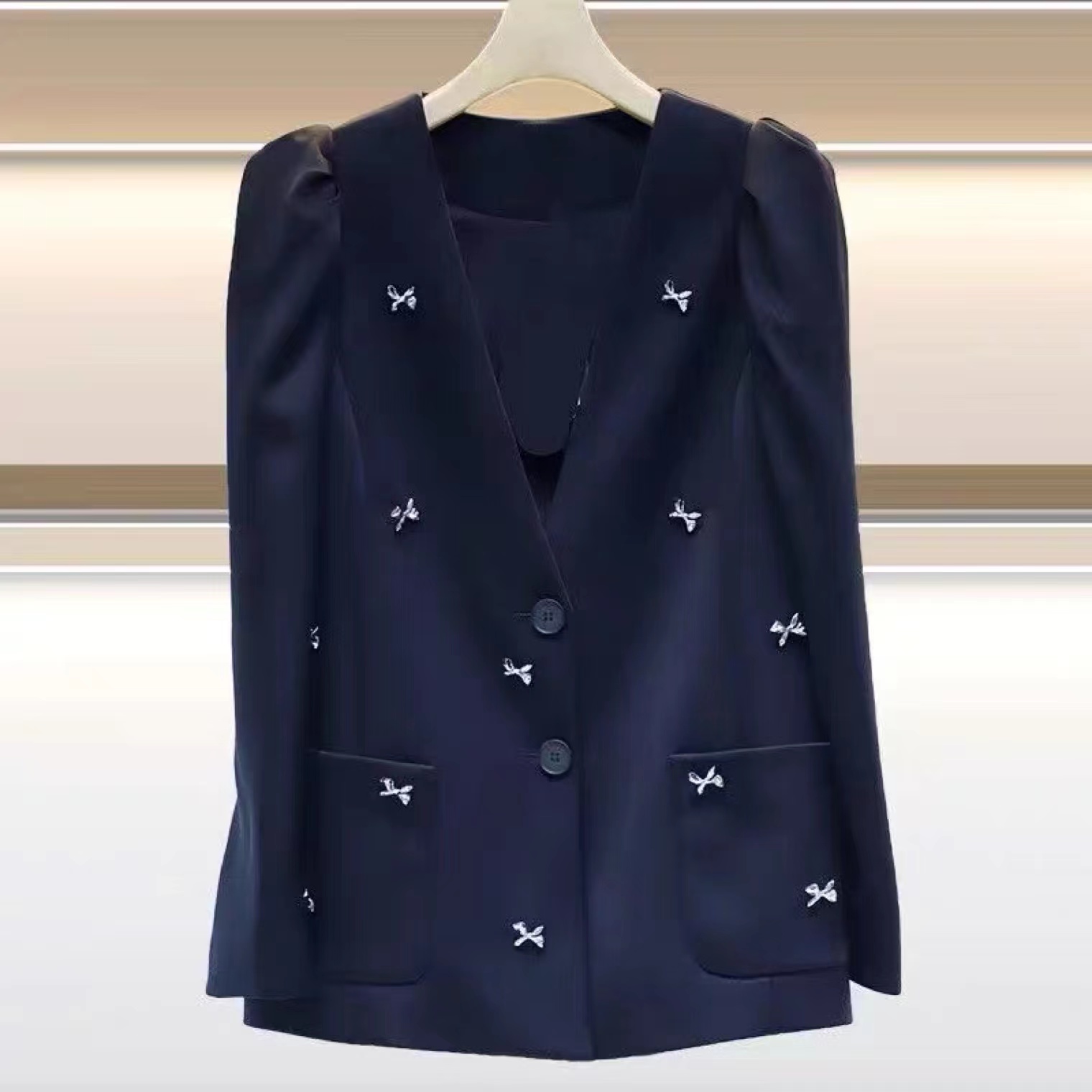 淑女装>>JORYA2023春款v领长袖金属蝴蝶结两粒扣外套