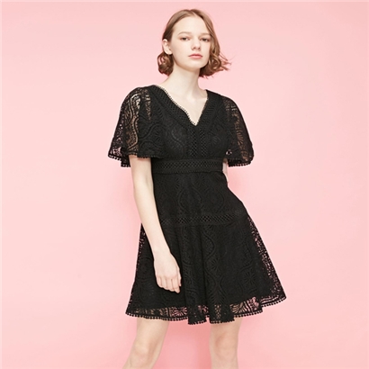少女装>>Vero Moda春夏蕾丝V领小黑裙桔收腰显瘦气质连衣裙女|31936Z520