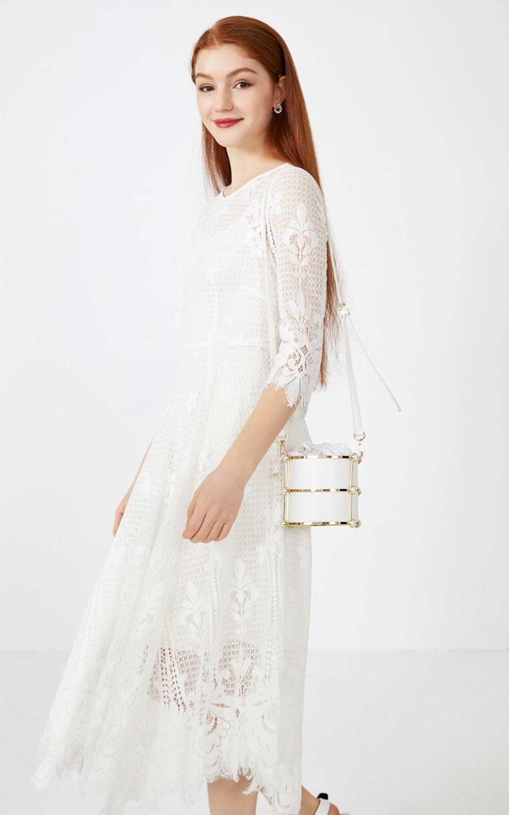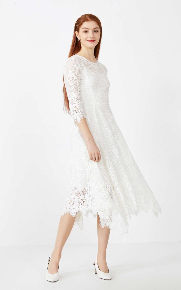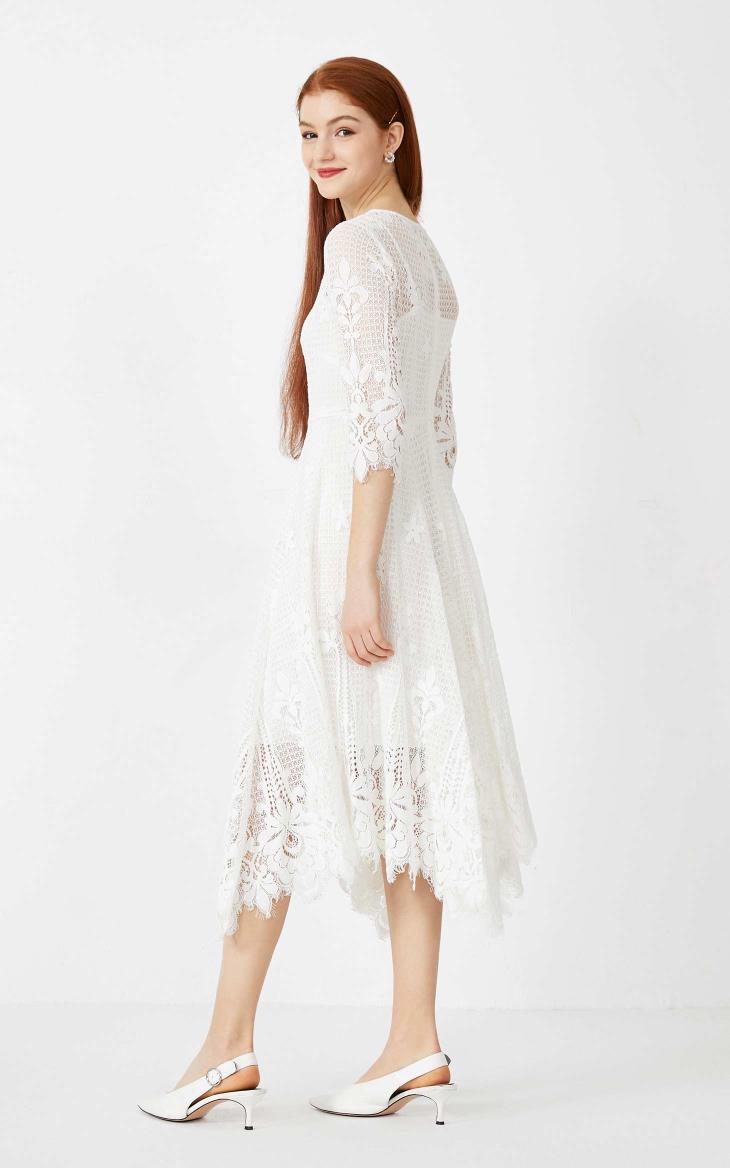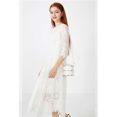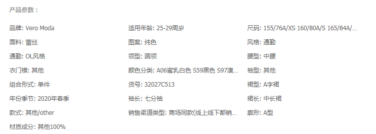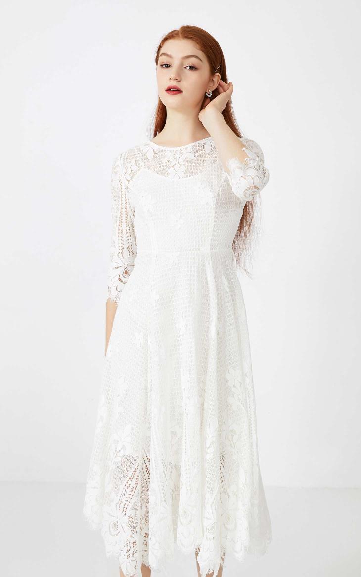 少女装>>Vero Moda2020春夏新款圆领七分袖蕾丝长裙连衣裙女|32027C513