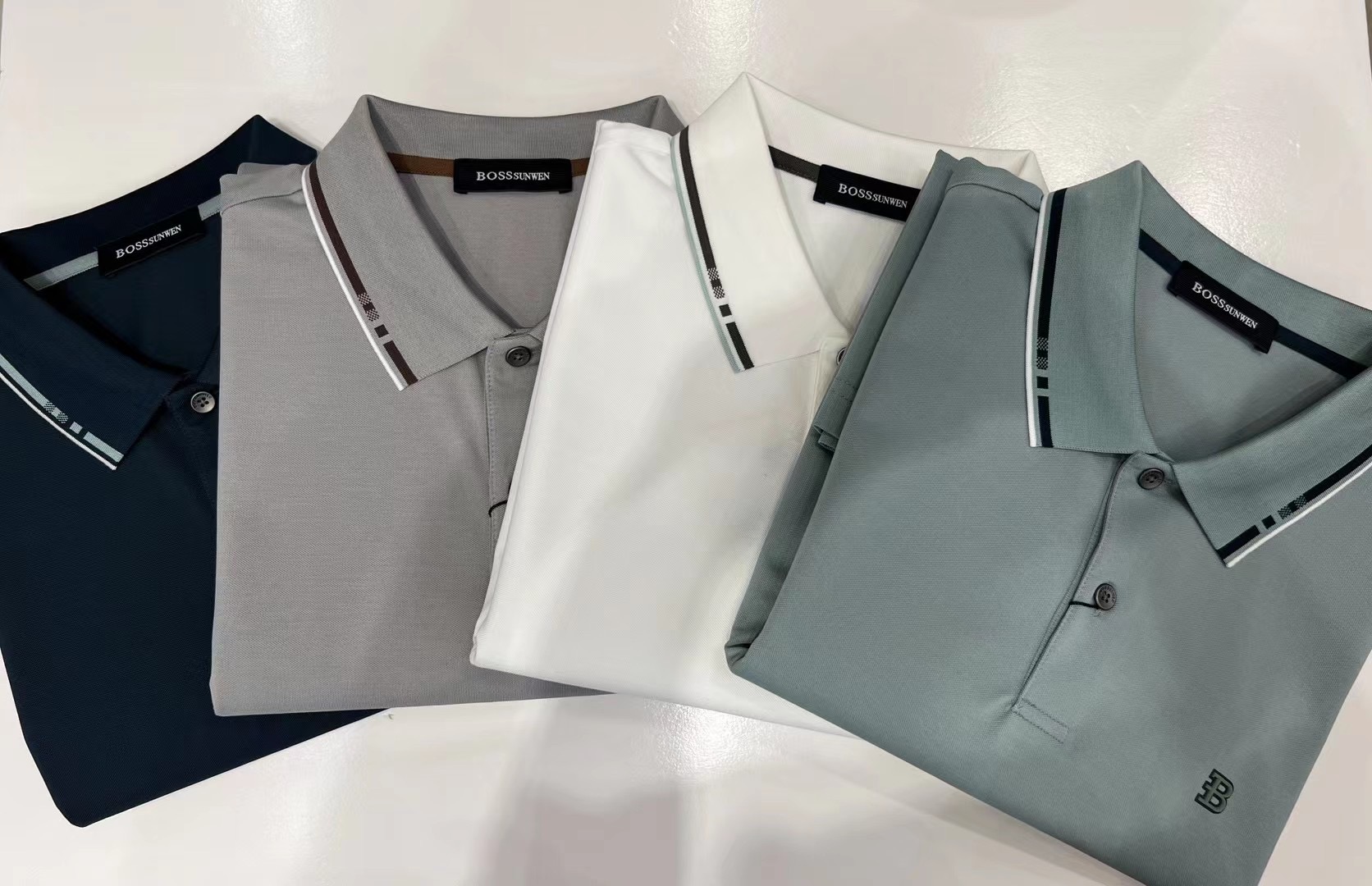 此款T恤采BOSSSUNWEN专属创新的凉感黑科技面料,穿着亲肤爽滑,有抗菌功能,夏日穿着无异味且不易变形