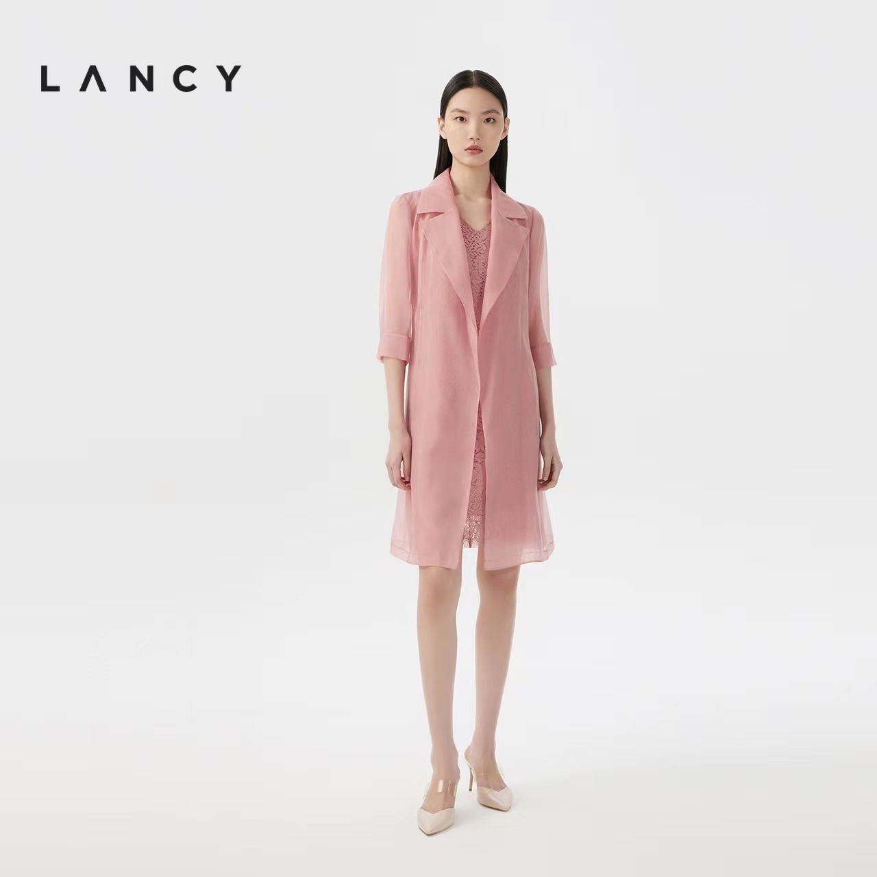 朗姿夏季两件套内搭蕾丝连衣裙