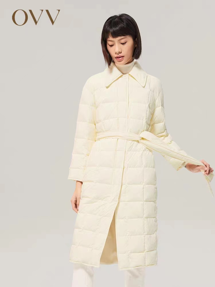 OVV秋冬女装翻领系带收腰长款直筒宽松90鹅绒羽绒服