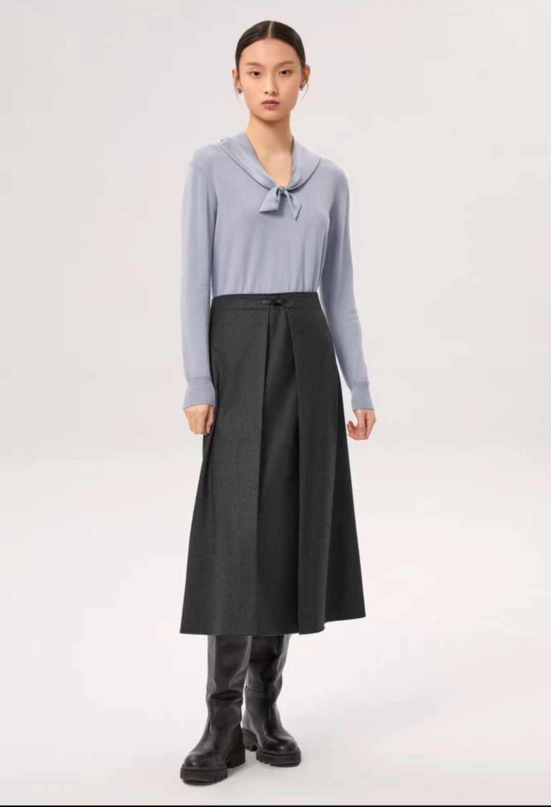>>OVV秋冬新款22MM缎面绉真丝领精纺羊毛拼接长袖针织衫