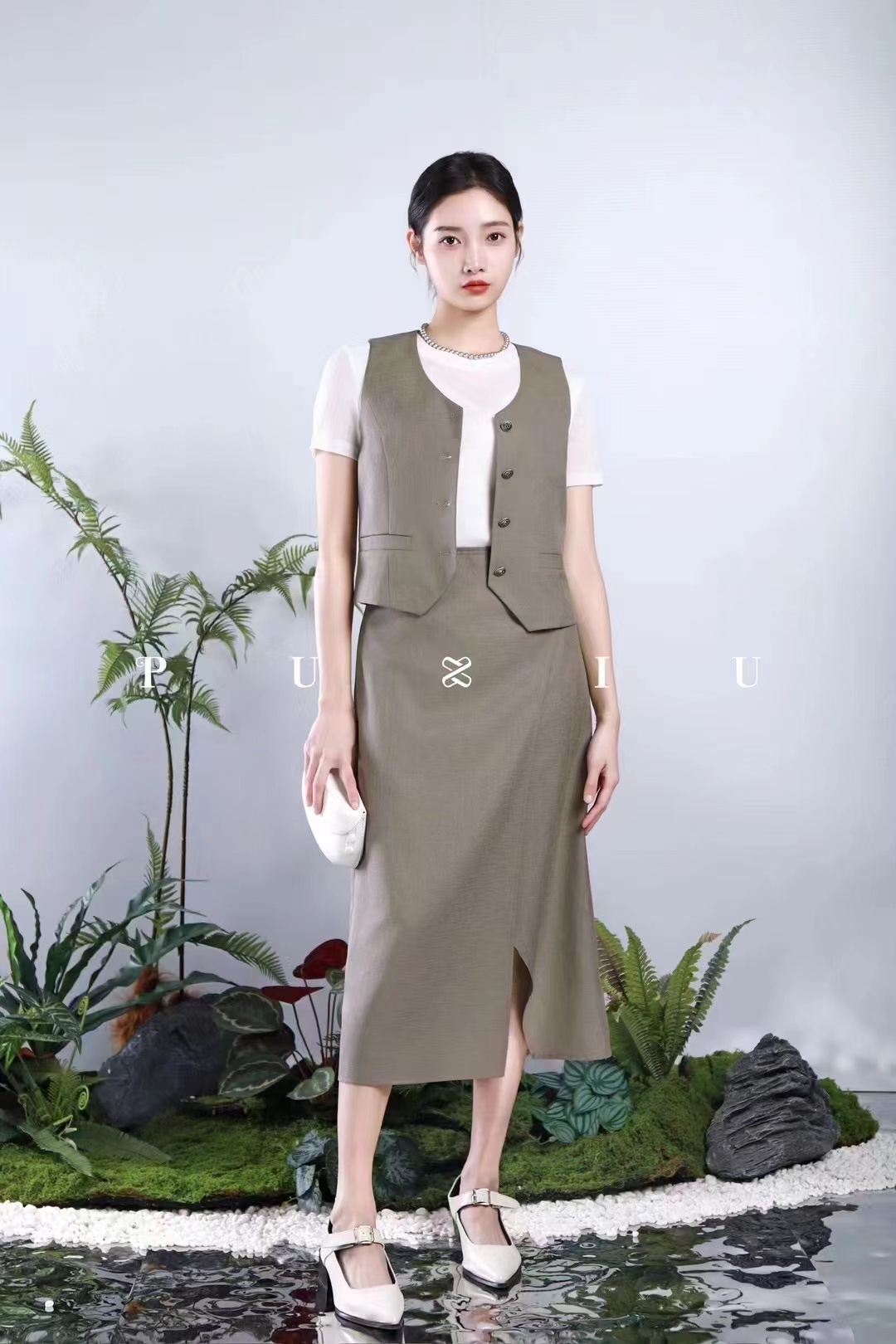 马甲套装选用抗皱TR面料,免去护理烦恼。搭配网眼体恤,通勤优雅