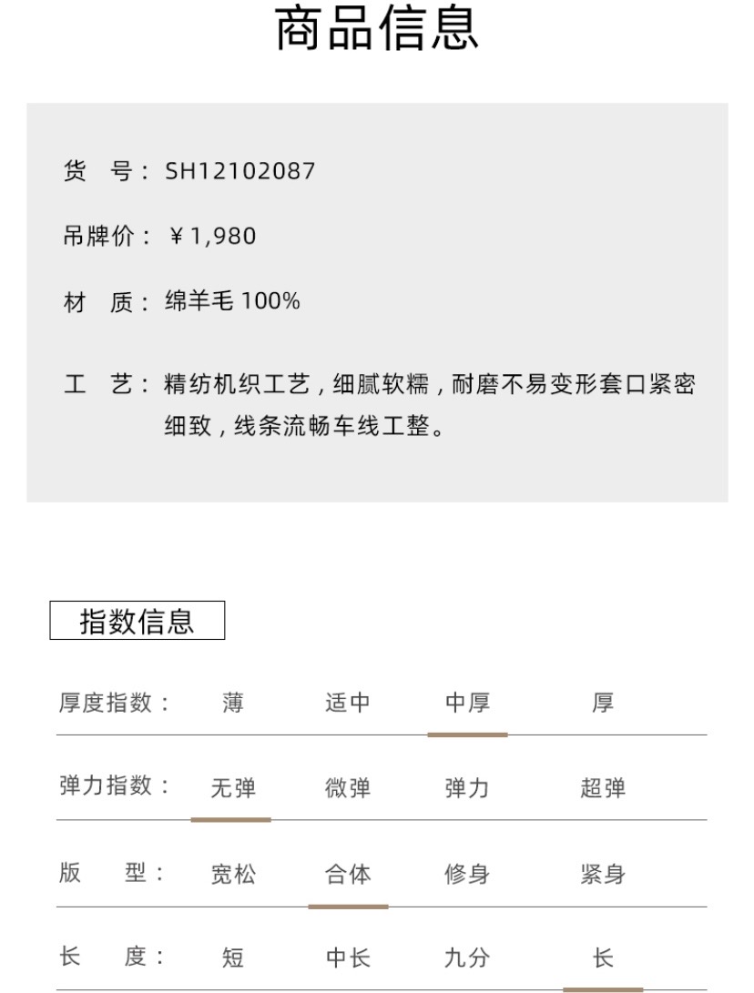 精纺机织工艺,细腻软糯,耐磨不易变形套口紧密 细致,线条流畅车线工整。