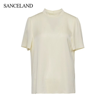 淑女装>>SANCELAND三石一澜夏双乔真丝小衫纯色立领短袖上衣SI21201026