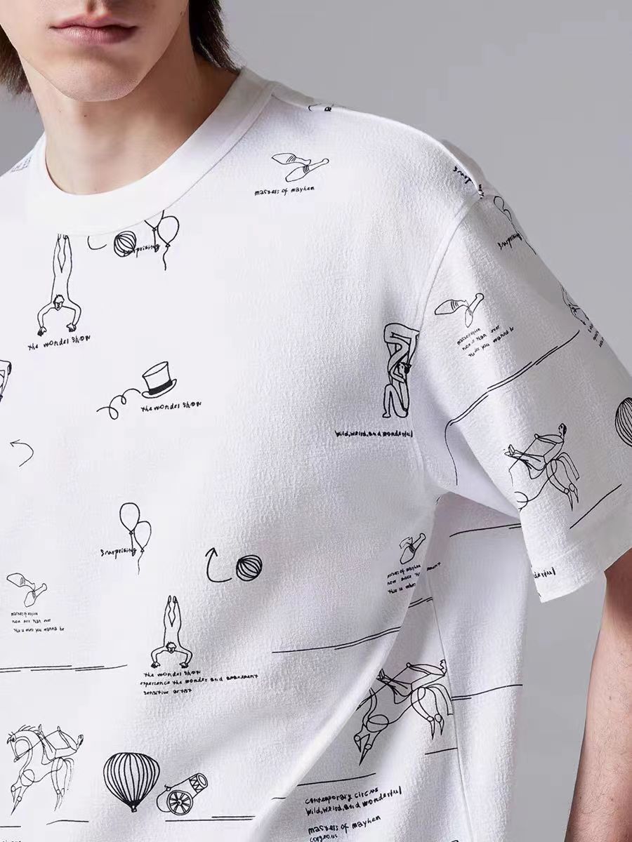 宽松版型 96%棉,氨纶4% 罗纹圆领,衣身满印漫画图案 侧缝旗标