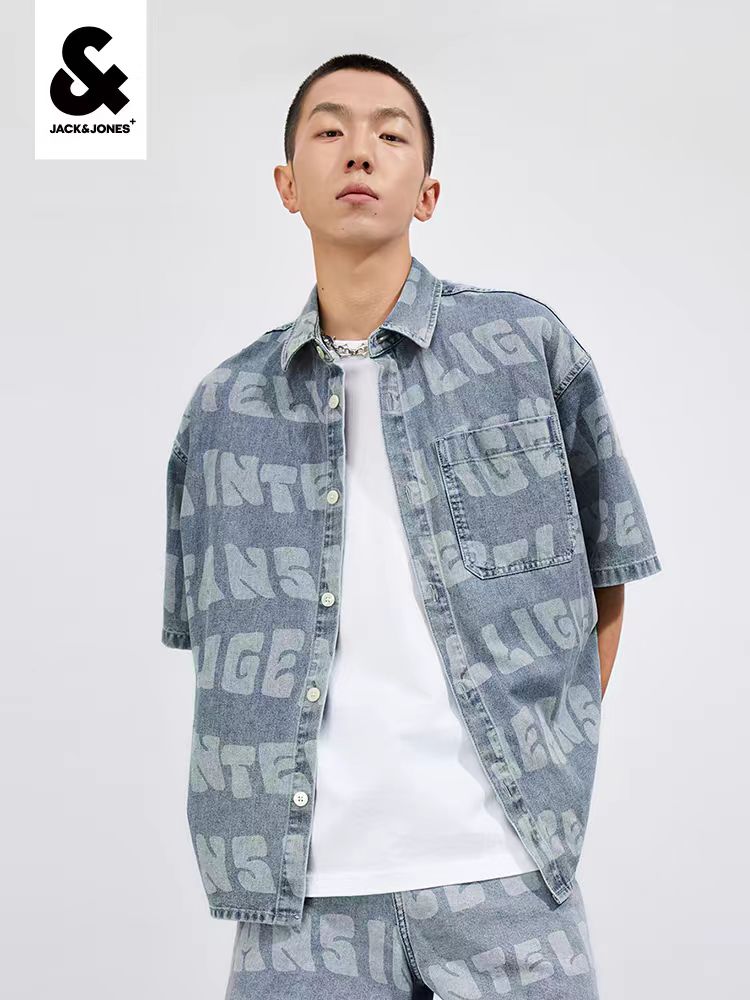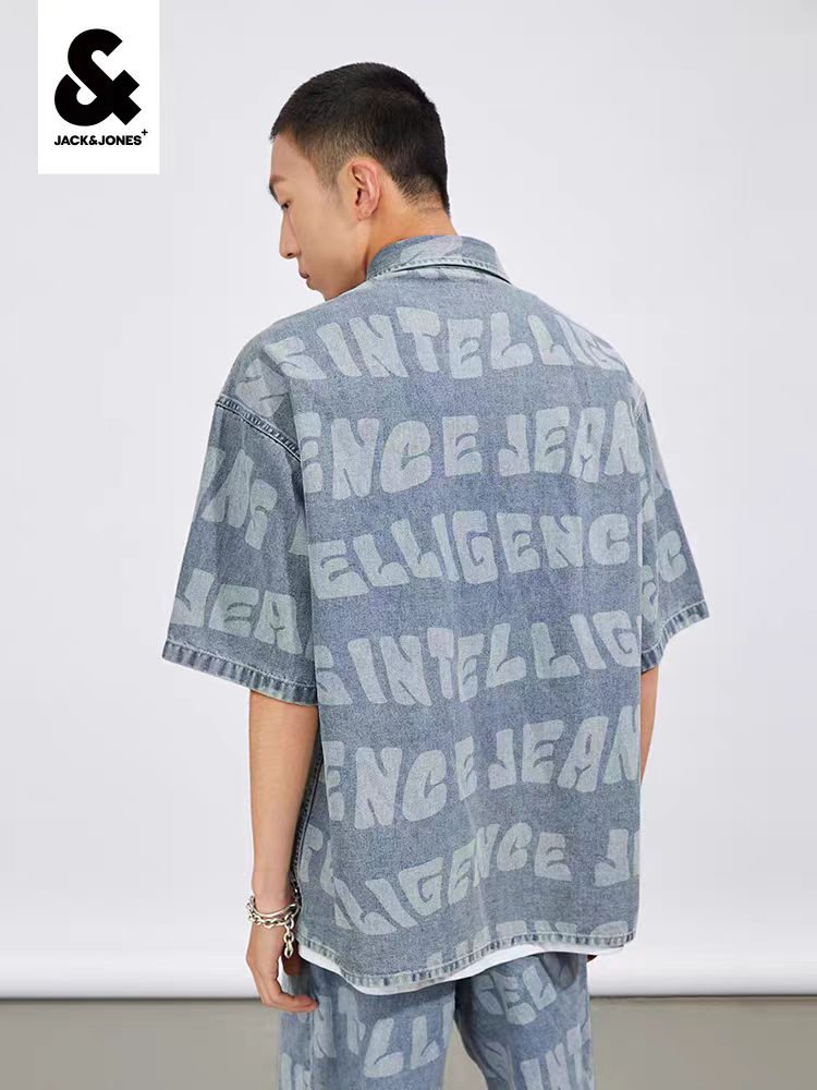 >>杰克琼斯个性百搭字母满印宽松牛仔短袖衬衫