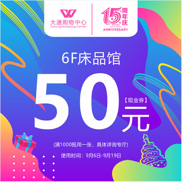 50元现金券一张 满1000元抵用一张,具体详询专厅 地址:六楼床品馆-维科家纺 联系电话:15958530431 具体详询各品牌专厅