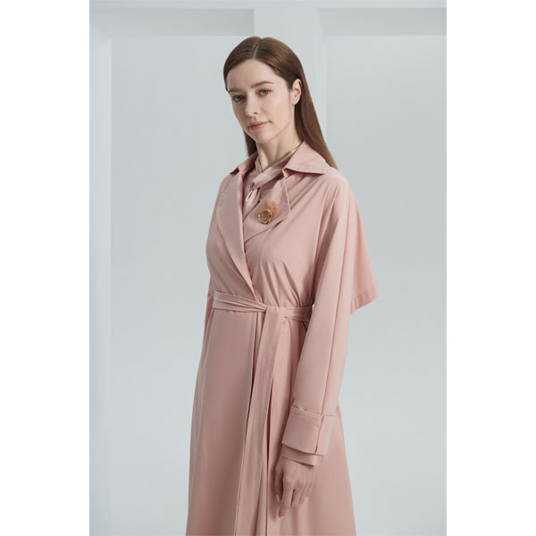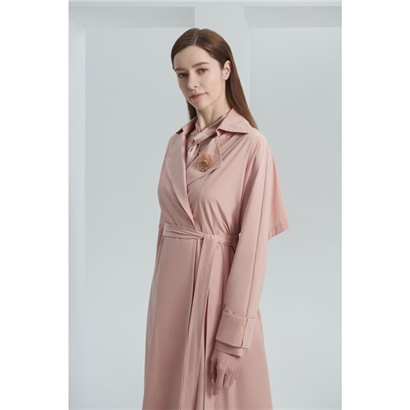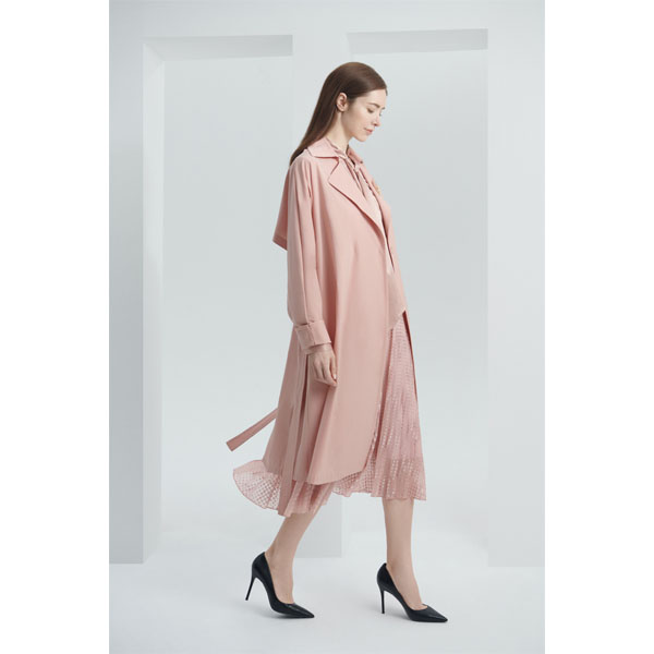 款号:LL9T012KWO017 此款风衣,显高雅气质;飘片缝位采用反折工艺,使服装更加平整高级;挡风片延伸至袖子设计,更加时尚;后背抽褶式腰带设计,包容性强,显瘦显年轻;面料双向弹力,手感光滑,穿着舒适。