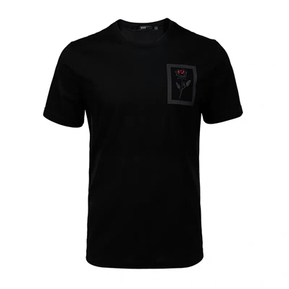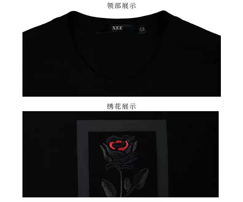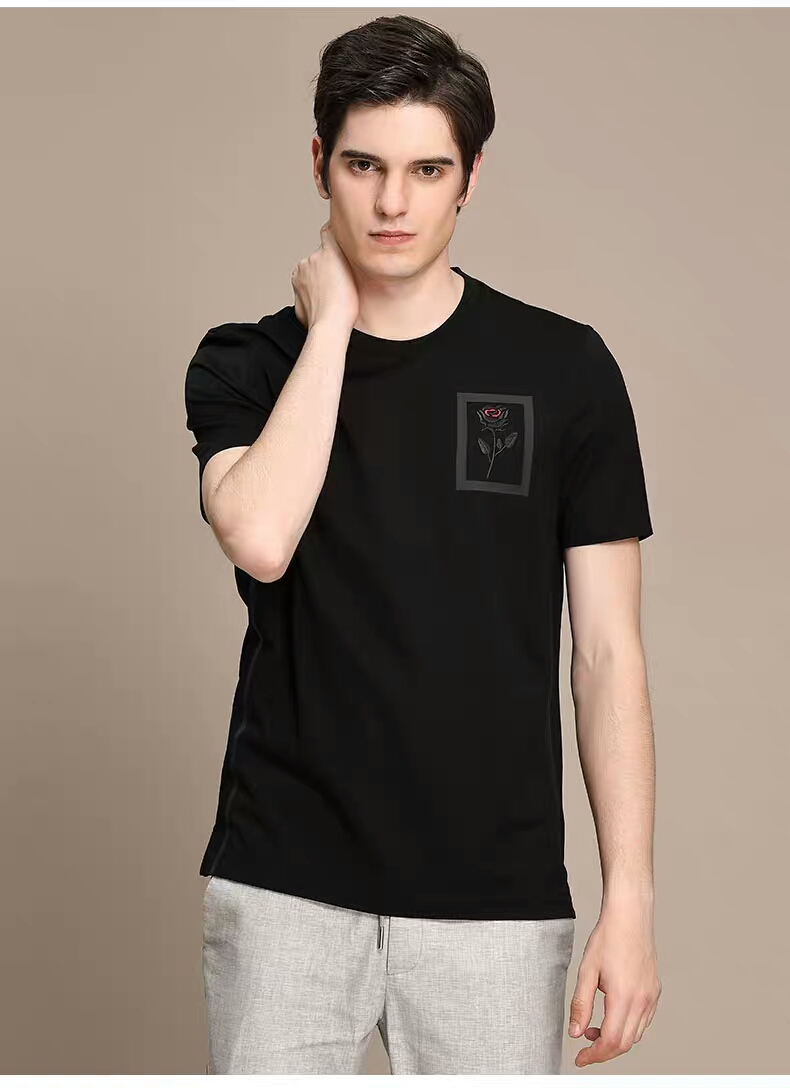 >>XEE商同款男士黑色圆领真丝顺滑短袖玫瑰绣花休闲T恤