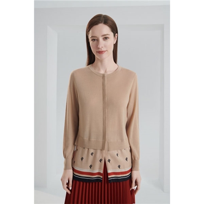 针梭织拼接,更加时尚;针织部分采用超细羊毛纱线,穿着舒适透气性好;梭织部分采用最新logo印花,并且是丝巾装饰效果,更显时尚;另外丝巾印花装饰,采用定位印花,在印花和服装制作中耗时耗料,体现了这款服装的精致。