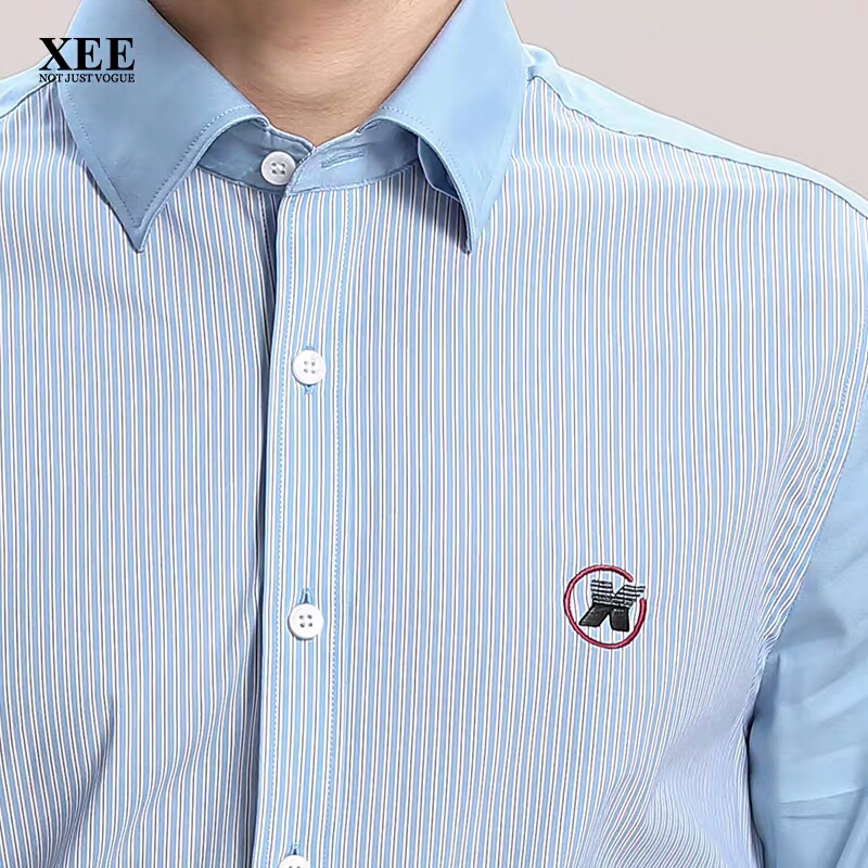 XEE商场同款男士蓝白条纹拼接绣花丝绵混纺长袖衬衫