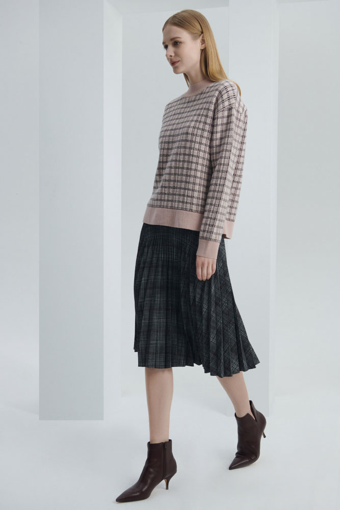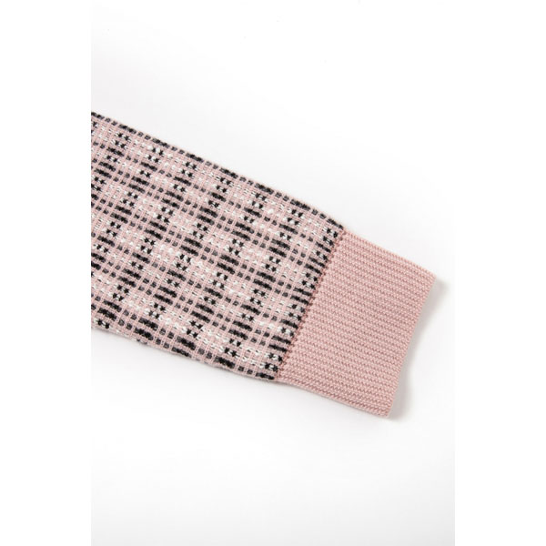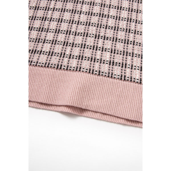 芋粉混色羊毛面料细腻软糯,温柔雅致,甜美减龄;精致提花工艺塑造立体格纹效 果,精致独特,唤醒复古摩登气质。