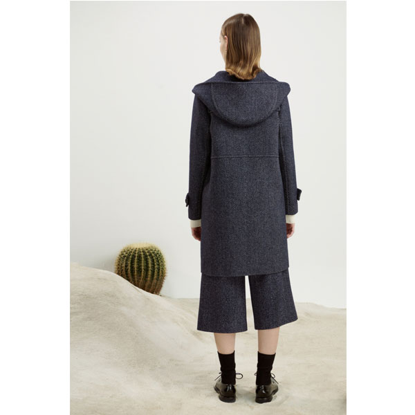 此款用了30支配色粗线,凸显设计,同时各个缝位都进行了特殊修剪,摸起来非常干净 整洁。学院风格的人字纹呢大衣,翻带盖、育克、连帽等设计组合,使这件衣服穿上显有少女感,活泼可爱重点工艺(对条对格)每一个细节部位人字纹都能精确的对上特色 面料(意大利进口人字纹羊毛混纺面料)完美版型。